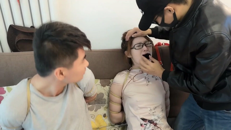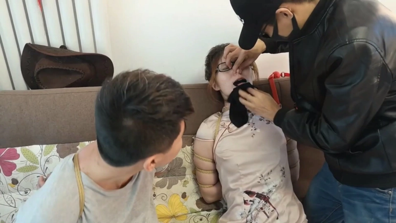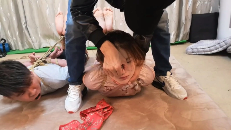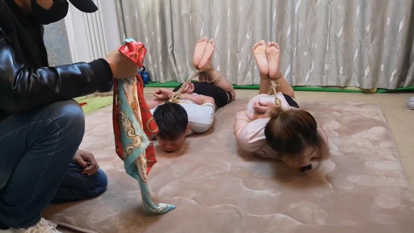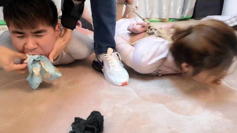 美女冷兮和其男友被歹人劫持,劫匪将他们情侣二人简单捆绑后分别脱下冷兮男友脚上穿的黑色锦纶丝袜和冷兮脚上穿的白色锦纶丝袜,恶趣味般分别将两双锦纶丝袜交换塞入情侣二人口中,令他们苦不堪言,随后劫匪去屋内翻找财物。
