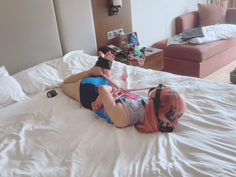 这就是小茶茶的状态:被极限驷马绑的结结实实、连小脑袋都被迫抬起来。硕大的马具口球卡着嘴巴和下把,让茶茶几乎发不出呜咽声、敏感的小脚丫承受着[X_X]的持续刺激,全身又要时不时承受她最畏惧的电击痛苦。