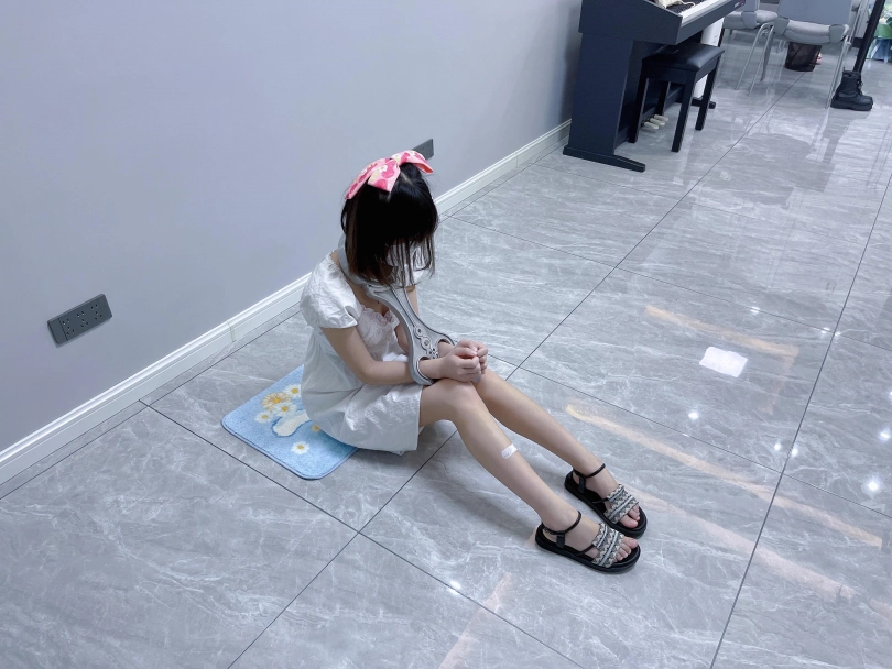 更换监狱内两种款式的凉鞋并展示。让小囚犯茶茶跪在地上,面壁思过。