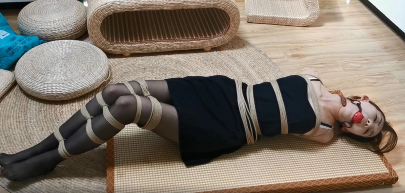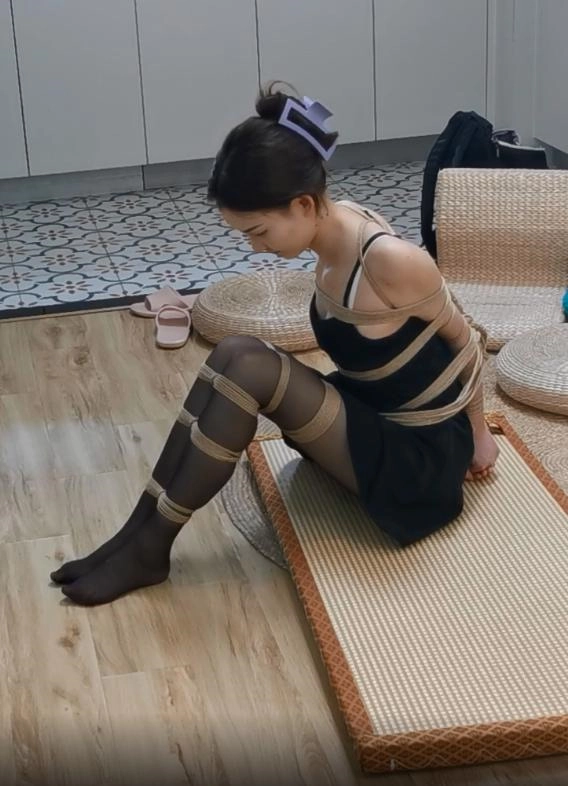 模特果果,多绳直臂捆绑,吊带连衣裙配黑丝,口含口球捆绑放置,绳子偏松散了点,模特却很唯美。