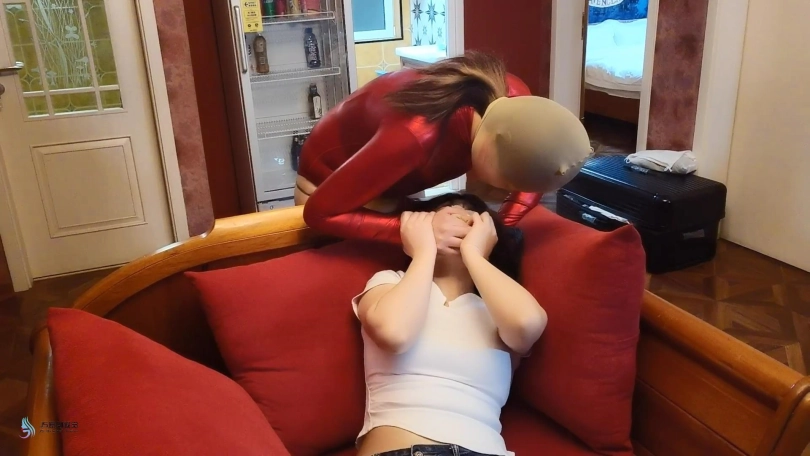 但女贼并没有停下的打算,她放开了女主,并给她穿上了一件拘束衣,眼睛被蒙着,嘴巴塞进一只口球。女贼再次用快乐棒和脚不断刺激摩擦着女主的下面。女贼牵着她在房间里来回走,并一边抽打着她。并再次将女主牵回房间床上。就在女贼想进项下一轮游戏时。一名蒙面男人闯了进来走后面抱住女贼,并将她迷晕。