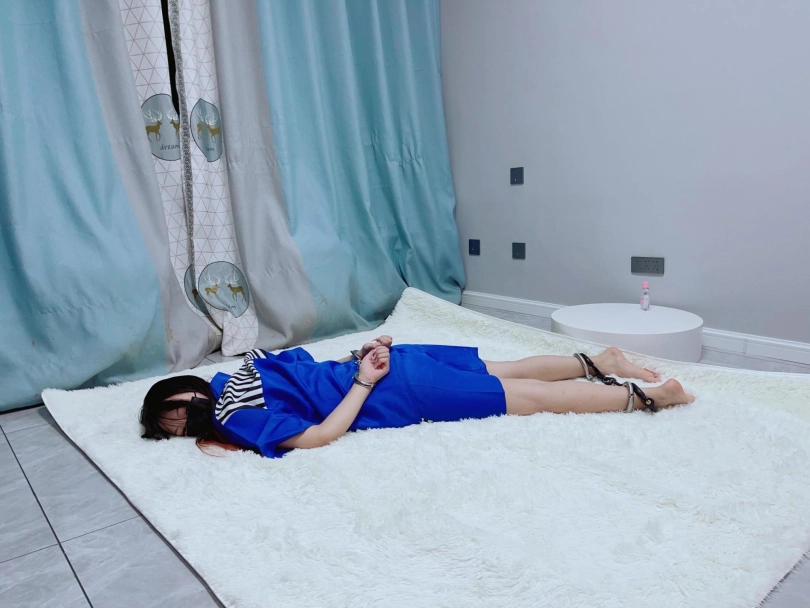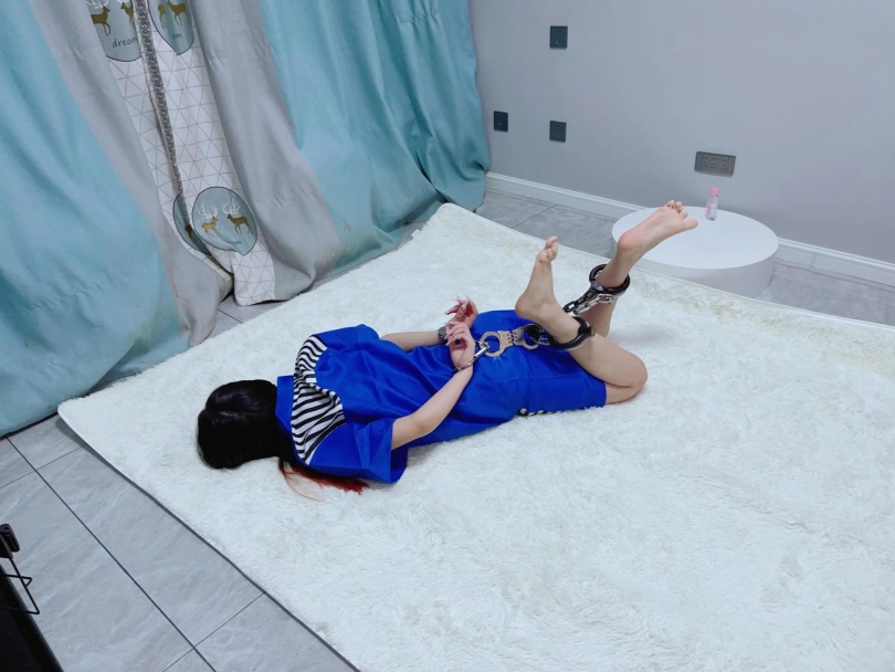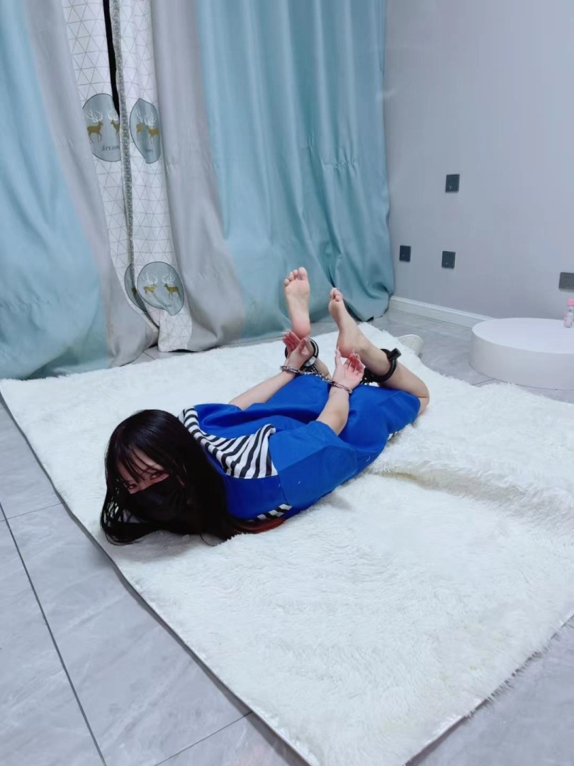 最后用一个筒铐连接手脚的镣铐,让糖糖以女死囚的身份驷马在地板上过夜。