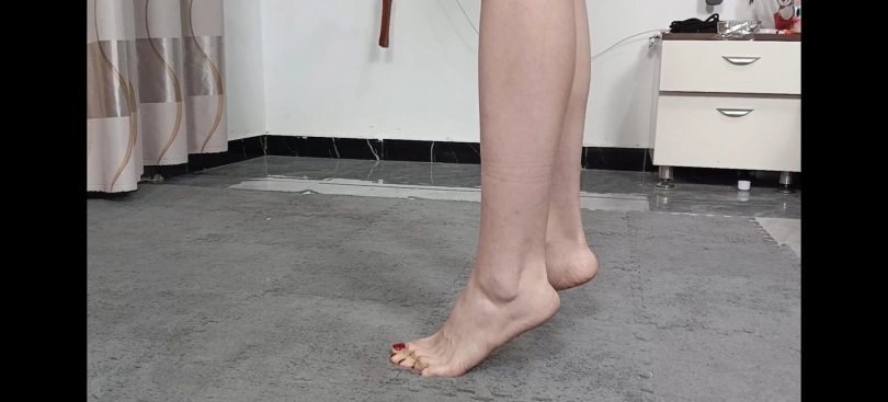 分为极限踮脚和背缚内衣走绳,极限垫脚为调高绳子高度,仅脚趾着地。背缚内衣走绳为仅着内衣,背缚状态走绳。全程模特以极痛苦的姿势脚极高的垫起,绳子陷入股缝走过一个个绳结......