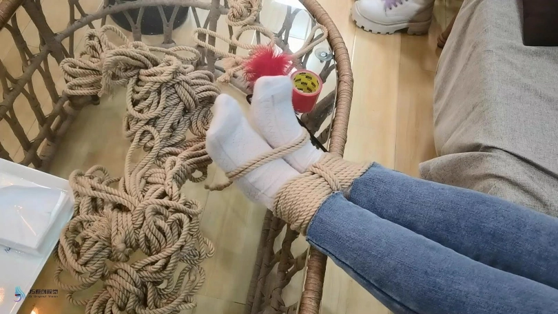 女人网购了一些绳子等玩具等着老公回来,男人回来后,女人就迫不及待的说要玩点刺激的游戏,让男人用桌上的绳子绑她。男人将她捆绑起来,用丝袜塞进她的嘴里,外面用胶带封住她的嘴,放置她吐出嘴里的丝袜。再用丝袜头[X_X]住她的头。用一双连裤袜蒙住她的眼睛,给女人再带上一个口罩。这样紧绷的头部轮廓看起来很性感。男人脱下女人的靴子,不断亲吻女人的穿着棉袜的脚丫。将她的脚捆绑起来,开始挠她的脚底。过了一会,男人用快乐棒刺激着女人的裆部,强烈的刺激感让女人身体扭动,脚趾不断的绷紧并发出呻吟声。看起来她很享受。