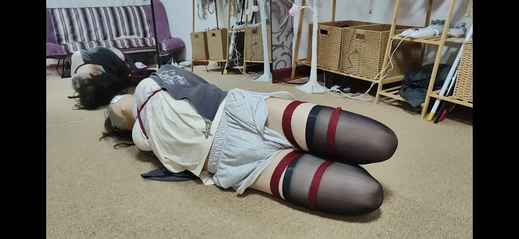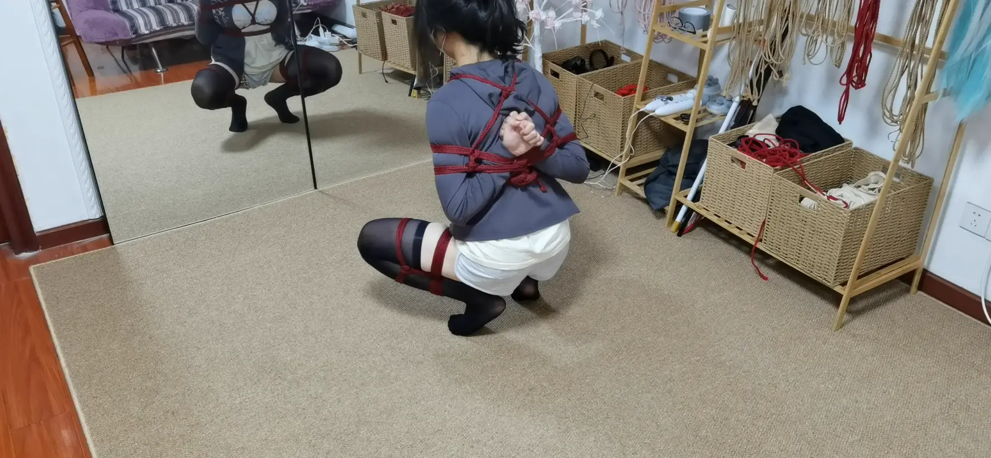 小m真的是有一套自己的审美,又是小短裤又是紧身小外套,露着个T恤边边在外面真是奇怪,那个大肉腿加上黑色长筒袜还不错,没事一会加上绳子就好看了,小m先是自己捆好了折腿接着就被半强迫的捆上了后手观音,然后在镜头面前骚姿弄首,任由他挣扎也无济于事,什么?后手已经适应了?那再捆个直臂给小m难受难受,既然被捆上了那为何不让大伙看看小m的真容呢,真是好奇呀,把他的口罩摘下来看看吧,work out怎么嘴巴也被塞上了,这么钟意玩那就陪你玩啊,给你把手手也裹上胶带,再把你的腿跟手臂也连上,看看你挣扎的样子吧,真是涩情,你就在这里沦为活动的家装吧。
