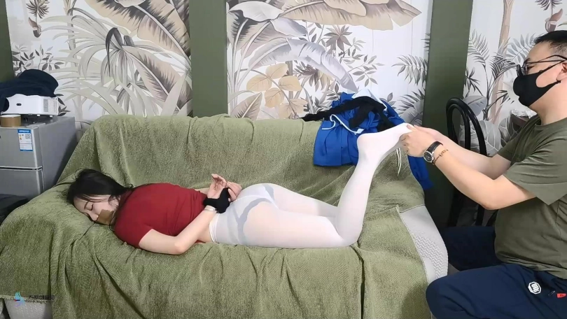 女主被捆绑在床上,镜头给女主全身游走镜头(从头到脚的展示),给足部和脚腕捆绑特写和脸部堵嘴特写。特写结束后女主醒来,开始在床上挣扎呜咽,持续约2-3分钟。随后尾随者进入房间内将女主迷晕,后将女主公主抱抱起,对着镜头环绕展示后(15秒以上),给足部和脚腕捆绑特写和脸部堵嘴特写,将女主抱至客厅沙发上后放下,随后坐上沙发,将女主搬至怀中,开始抚摸女主丝袜臀部腿部(固定镜头保证女主全身都入境),翻女主的眼皮,镜头给女主堵嘴的面部特写。随后将女主放回沙发面朝下,解开女主脚腕的绳子,开始冰恋玩弄女主脚部(抚摸脚面脚趾脚底,抬起后放下),抚摸女主小腿。期间女主醒来,爬起身逃向门口(手部捆绑尚未解开),被尾随者追上后从后抱住后迷晕(激烈挣扎+踢腿和呜咽持续10-20秒)。随后被公主抱抱起,向镜头展示后,将女主换成过肩扛抱,再次转圈向镜头展示(给足部特写和臀部特写)。将女主扛抱进入卧室后放置在床上,女主面朝上,后再次给女主全身游走镜头。