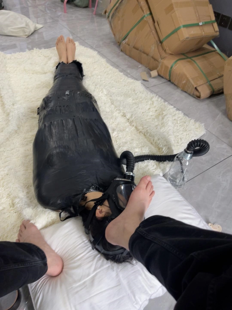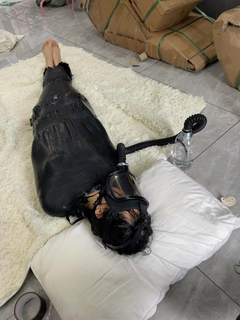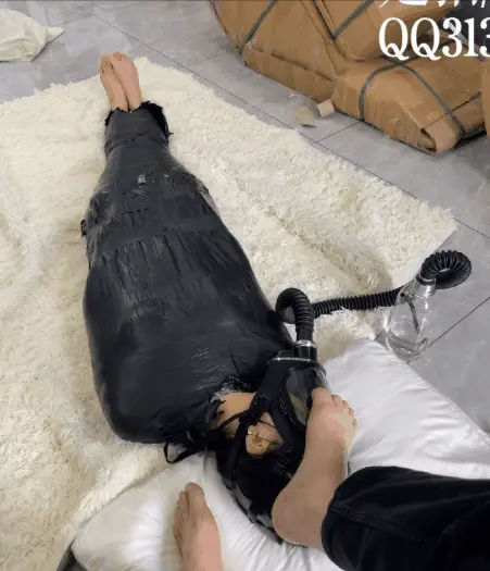 一小时后我才卸下负压瓶,不过还是要用手堵住呼吸孔。就这还不过瘾,我直接用脚堵住呼吸孔,妹子的求生欲使得她为了呼吸还是会继续拼命的嗅闻吸气..嘻嘻!