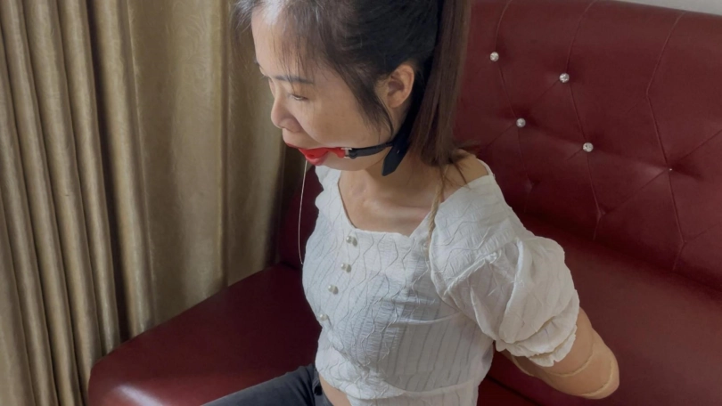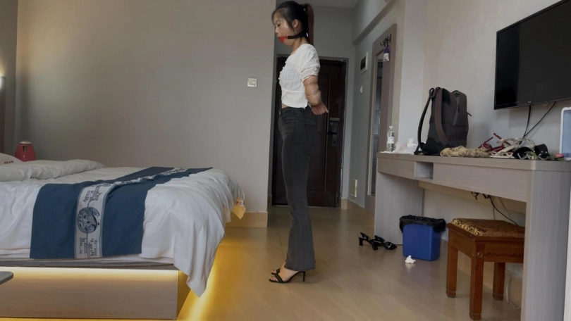 即兴拍了一次文文五花紧缚加脚铐,刚开始想让她挣扎自己解开,没想到绑得有点紧她也解不开,后面就戴上口球和脚铐,让她自己在房间里边走边挣扎,高跟鞋配镣铐行走不便又很痛,那是一个难受啊,口球也嘞到最紧哈喇子边走边流,直接就拉丝了,看着还是有点兴奋的,哈哈哈。
