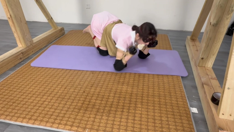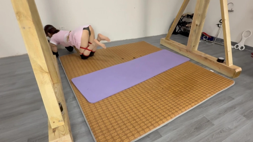 调教爬行了一会,将女友松绑了,女友说:还不过瘾,想被吊起来捆绑双腿垫脚,最后累瘫的趴在男友旁边。