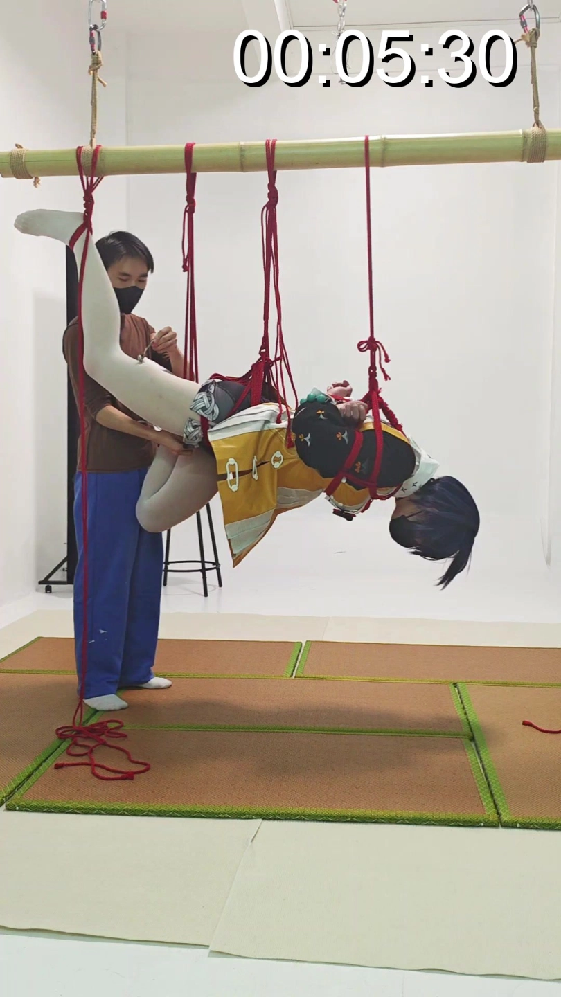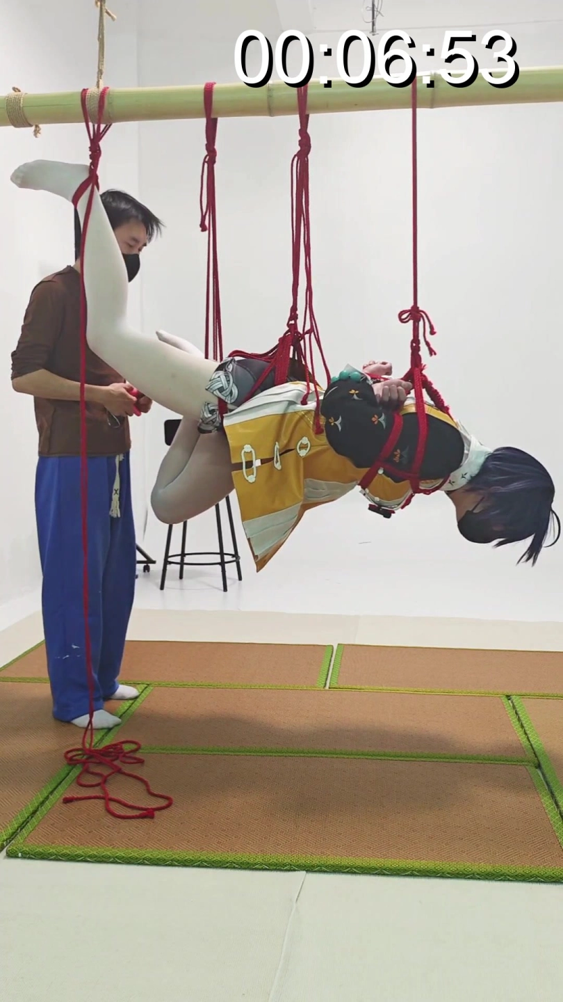 捆绑完之后当然是吊起来啦。一开始吊人可以一条腿一条腿慢慢来。让人有准备的升空。就不会很突然。至于后面出现的玩弄她的人。就不得而知了hhh