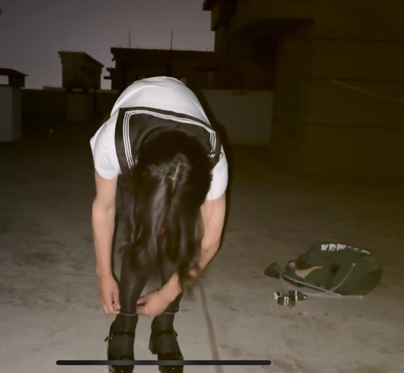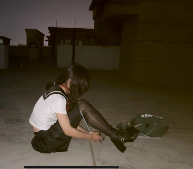提前再后面塞满了,再用黑丝包裹住,穿上裙子和水手服,高跟鞋,来到这个不知道会不会有人经过的天台。经常听到电梯上下的声音,特别害怕有人过来看到我aaaaaaaa