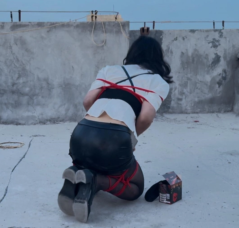 这次用的是两条十米的绳子,一条用来做一个简单的折腿缚,一条绑了一个日式自缚,因为天快黑了,甚至能在视频里看到日光逐渐变暗的过程,以至于后来闪光灯都自己启动了。这次绑好腿后,膝盖和双腿以及被小皮鞋包裹的脚就一直特别难受特别疼,绑好以后就想着赶快解开,结果还是费了好大力气才勉强解开。