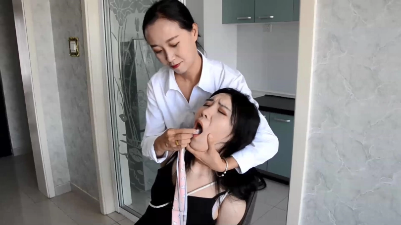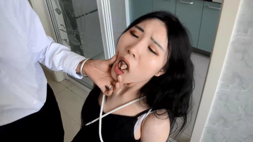 第三次塞嘴:文清说给吴晗换点东西塞嘴,找来三条小丝巾,首先把一条粉红色爱心图案丝巾一点点塞入吴晗嘴里。