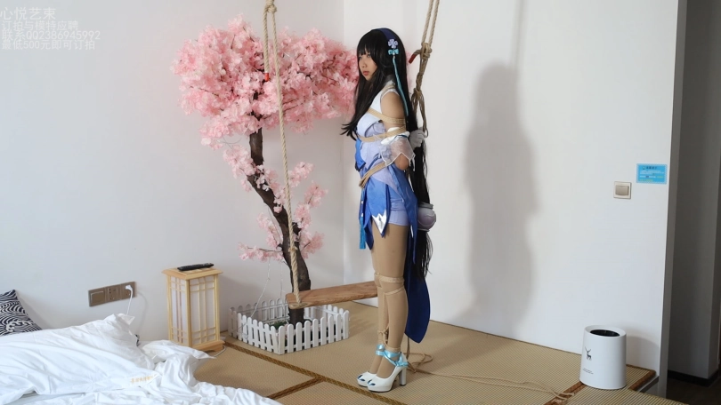 西施妹子被日式小高手紧缚,双腿被紧紧并拢一起,吊在秋千的粗绳上面。后来实在累了,就换成驷马紧缚,休息一下。小脚丫动来动去的好可爱啊。