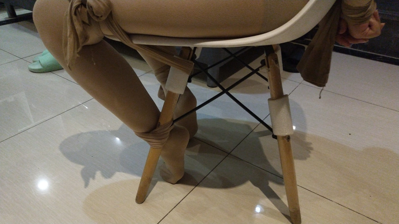 琳洛:连体袜衣,丝袜束缚在椅子上,头上套着丝袜,嘴里也塞着袜子;