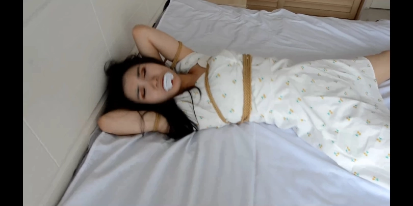 二人看劫匪走远了,二人在床上相互蹭丝袜脚成功弄下了文清脚上的黑色高跟鞋,再用脚互相蹭脚部绳头,却没有任何进展,用丝袜脚互相蹭脸成功取下二人的蒙嘴物(特写),文清吐出堵嘴物