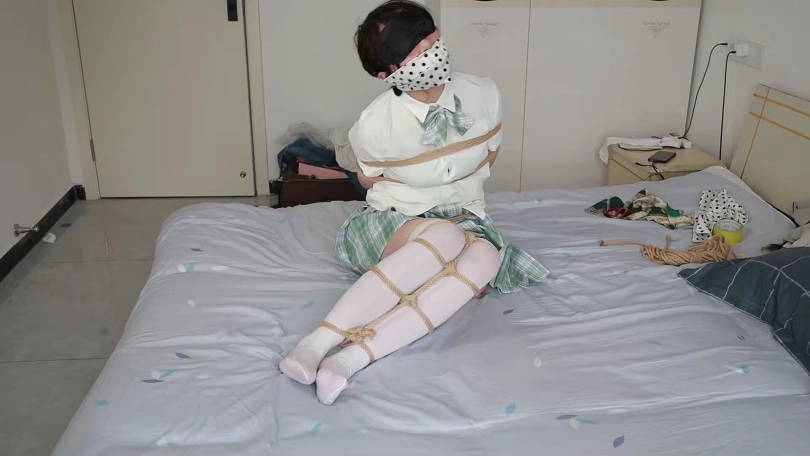 模特筱筱身材JK制服被入室捆绑之后,使用各种丝袜和日本经典丝巾进行堵嘴和蒙嘴,类似隶娘经典堵嘴方法,无法挣脱无奈被放置只能发出呜呜呜~~~~的声音