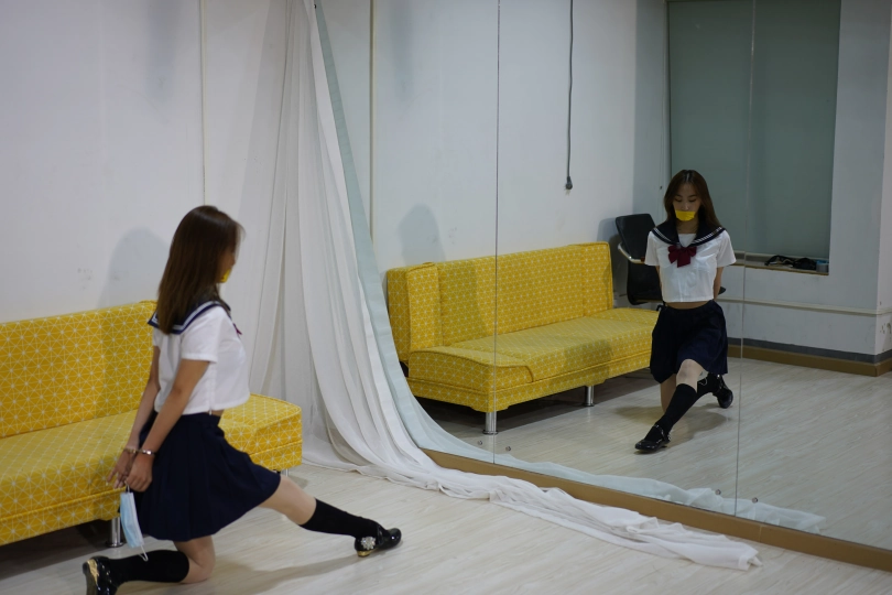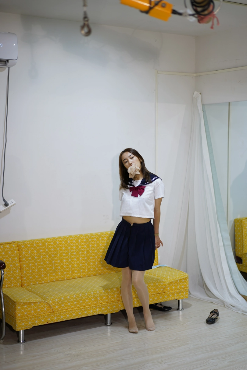 服装为水手服,肉色丝袜在内,中筒袜在外面,中途换丝袜跳舞,然后被丝袜蒙眼跳舞,难度不断加大。