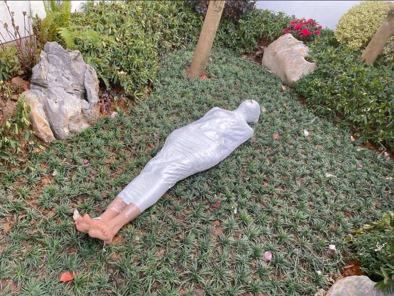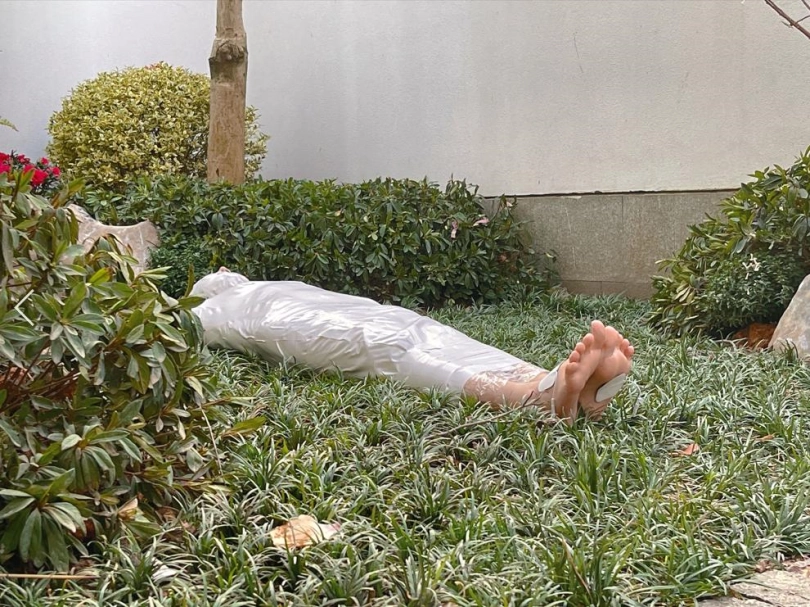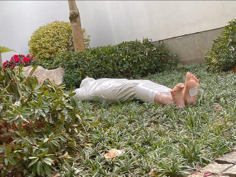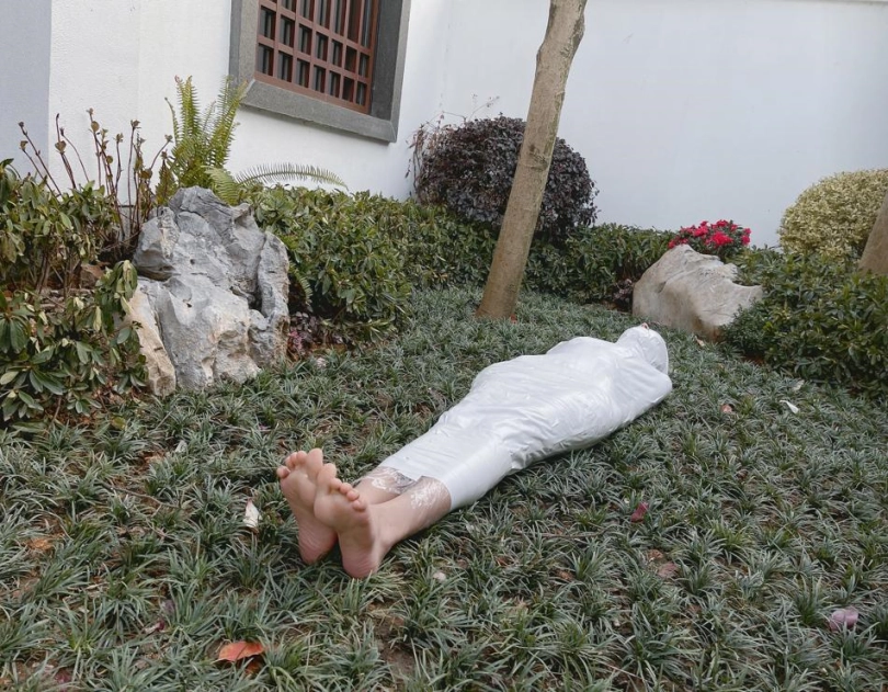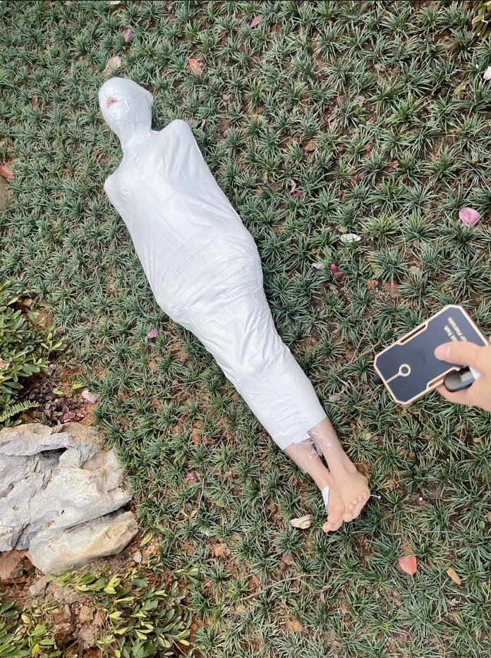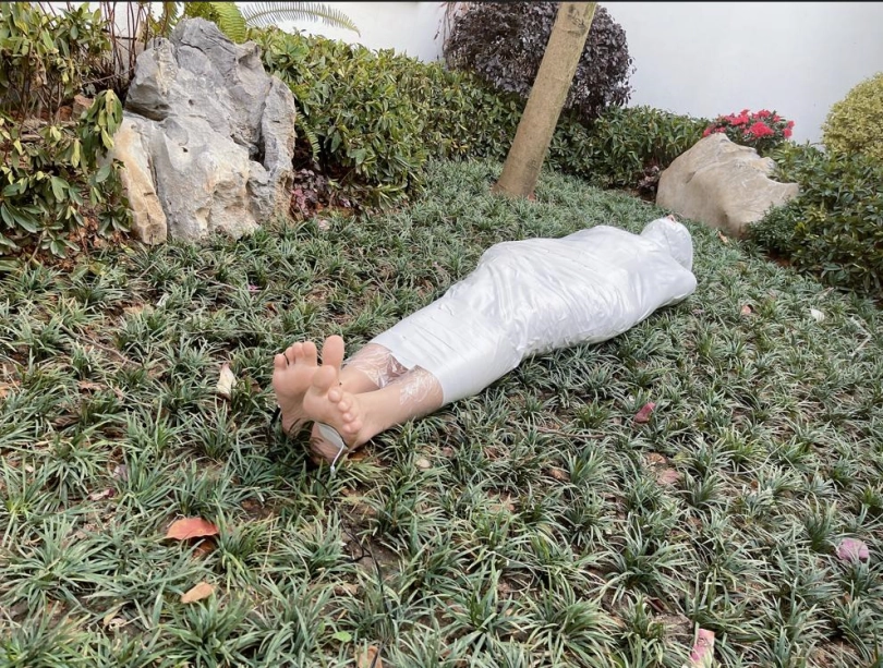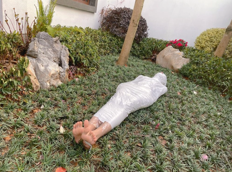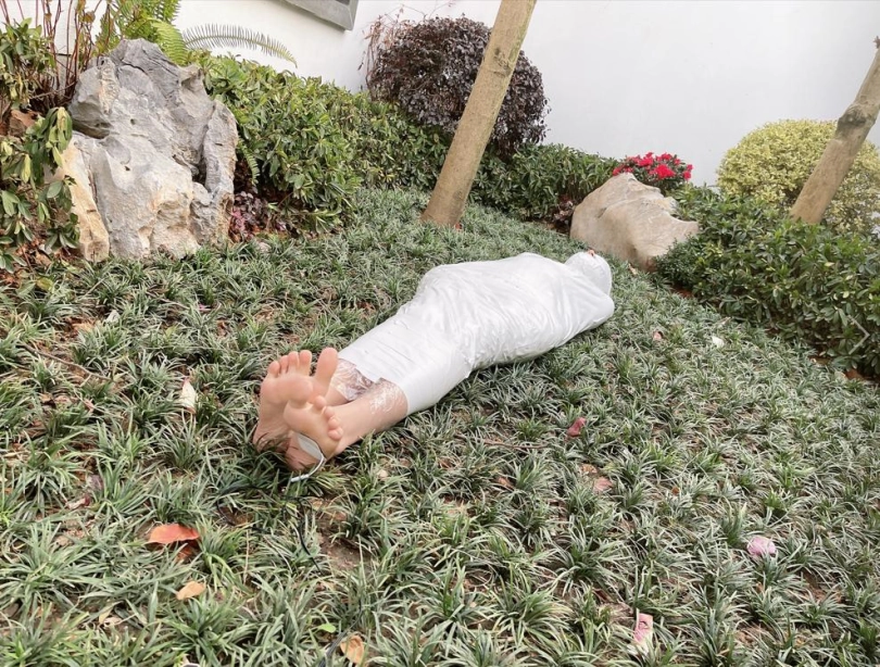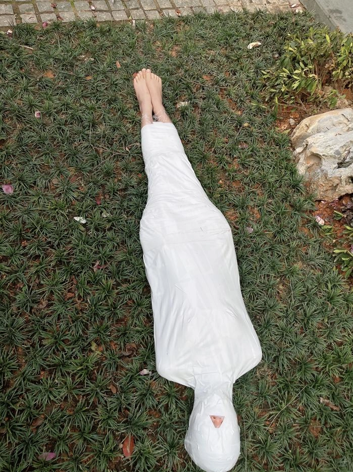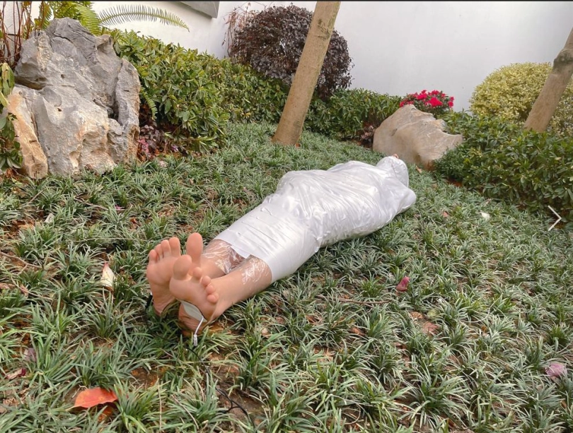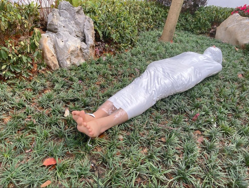 包好之后放置在位于湿地公园内一间别墅院落的草地里,只露出一对嫩脚心。夏天的草坪蚊虫超级多,茶茶白嫩的玉足就这么白生生的暴露在空气中,成为蚊虫们唯一的目标。挠一挠摸一摸,茶茶恐惧极了。
