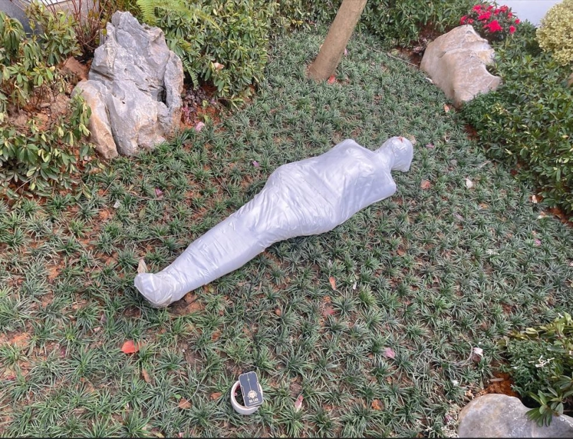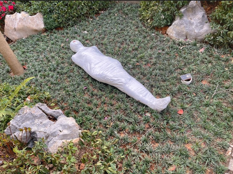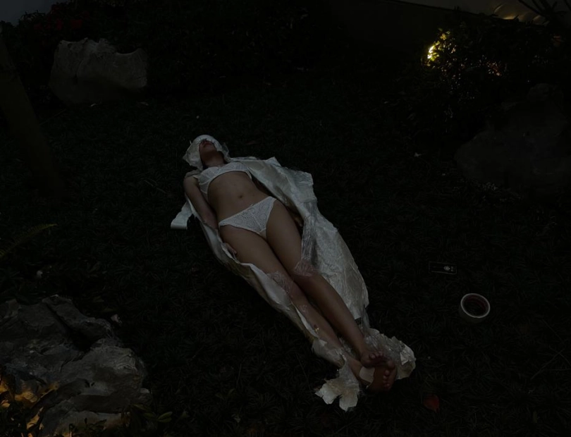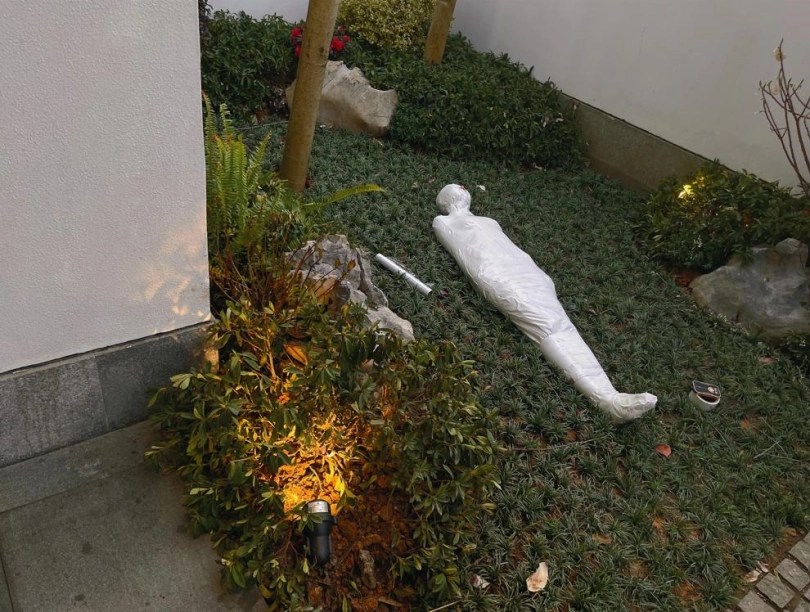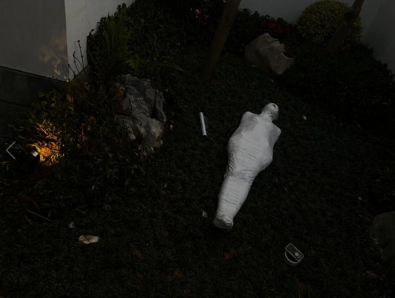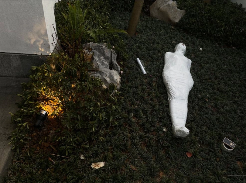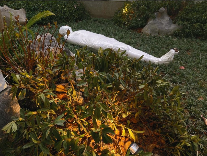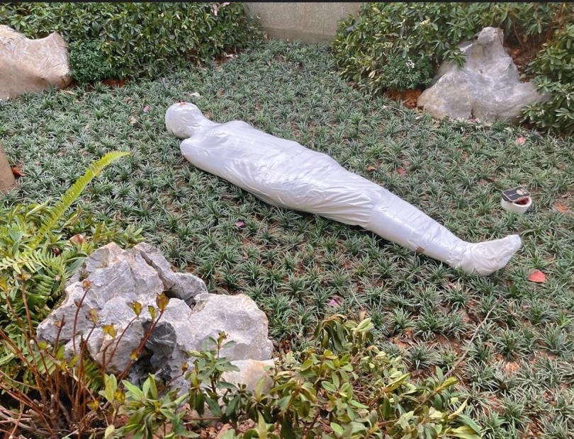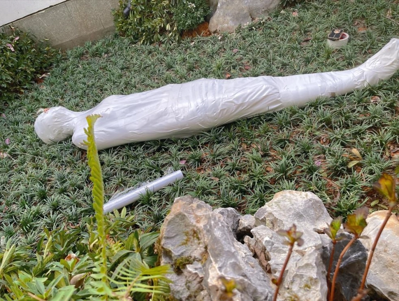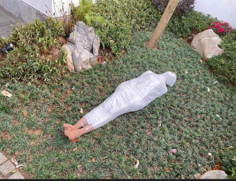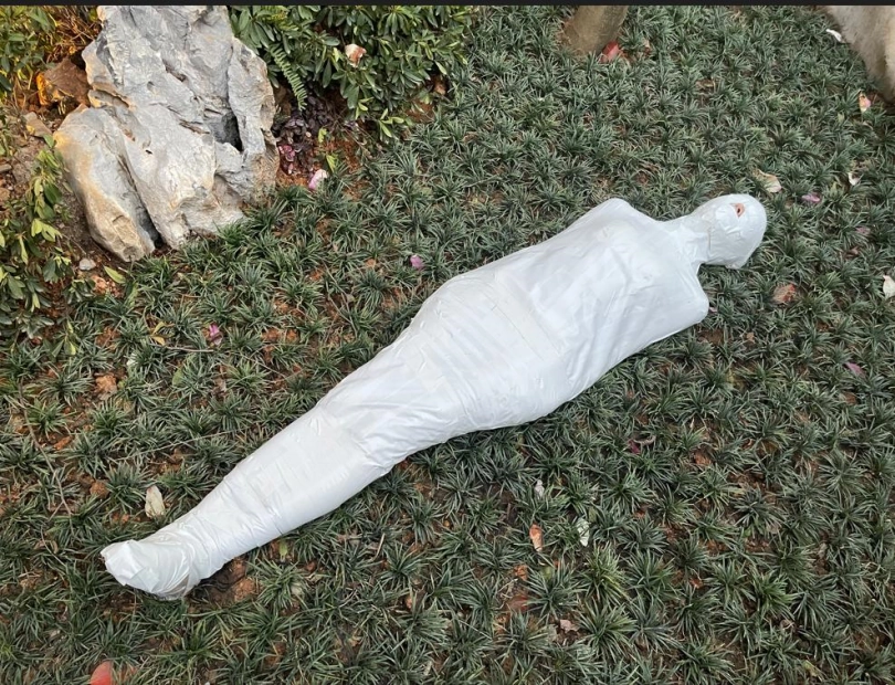 包好之后放置在位于湿地公园内一间别墅院落的草地里,只露出一对嫩脚心。夏天的草坪蚊虫超级多,茶茶白嫩的玉足就这么白生生的暴露在空气中,成为蚊虫们唯一的目标。挠一挠摸一摸,茶茶恐惧极了。