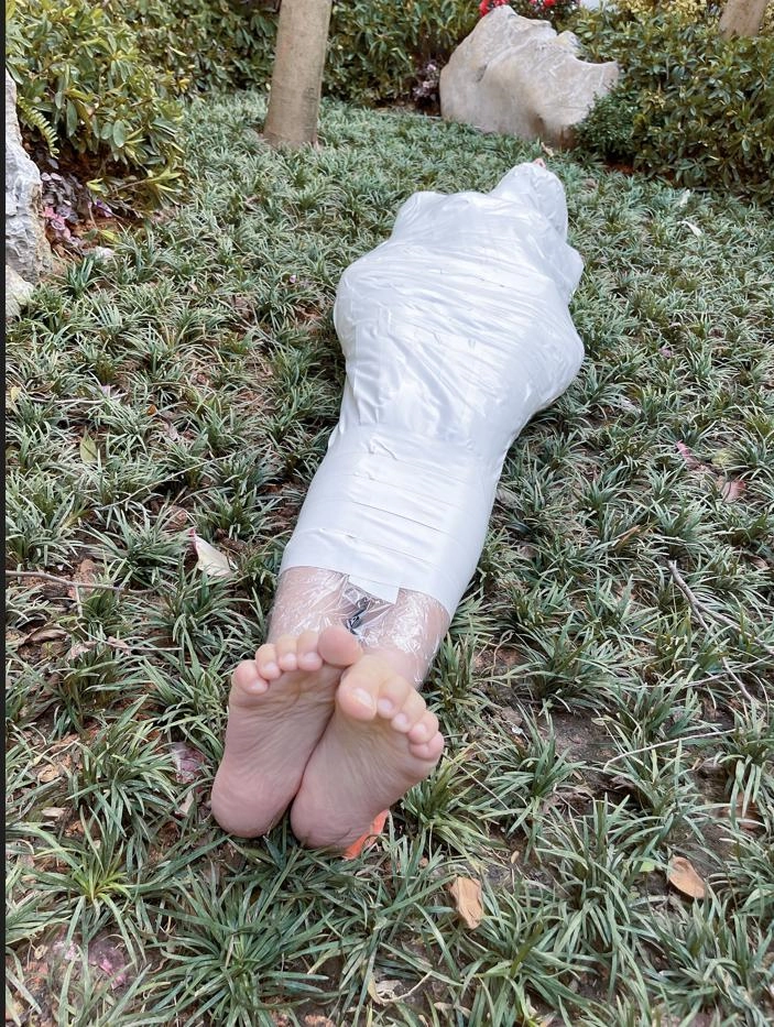 好吧,我全都要,那这次就拍一个户外-胶带全包-超长时间放置-虐足的作品吧~
