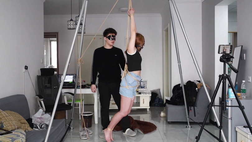 小姐姐被马具口球堵嘴双手被绳子吊起双脚离地被坏蛋挠脚心被暴露出的腹部和腋下也难逃毒手哈哈