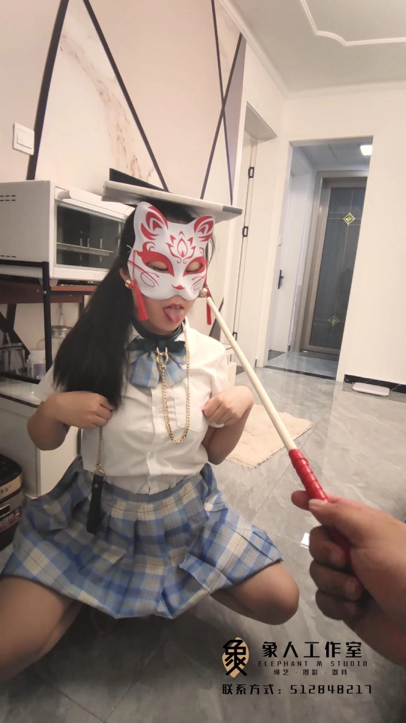 主人给小鹿拴上牵引绳,小鹿自觉的咬着尾巴放到主人手里,主人给小鹿戴上尾巴。脚踩在小鹿的头上,用藤条把玩下小鹿的尾巴。