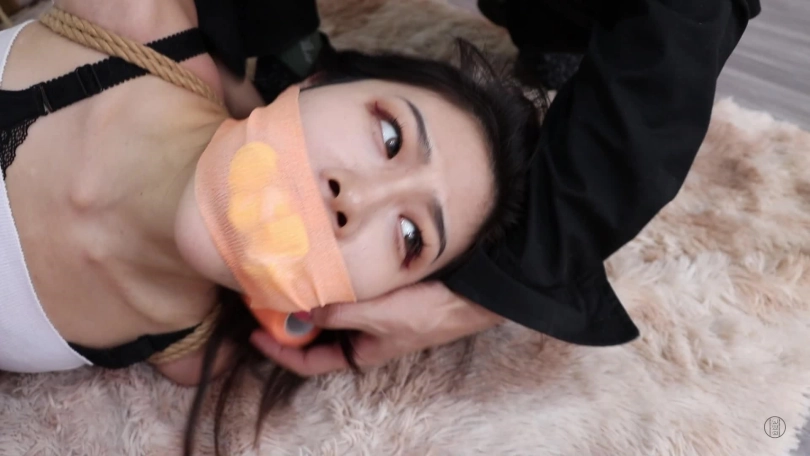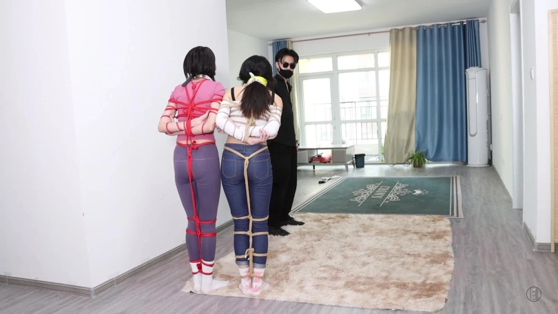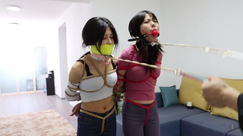 第二天,男主一觉醒来伸了个懒腰,睡得真香,可两个美女可就苦了,被折腾一晚上,累得睡着了,得男主使劲地拍照才把她俩弄醒,弄醒后男主可不会放过她俩,觉得她俩都不是好东西,打算跟他们换个日式勒胸缚,捆绑脚的蛇缚,就这个姿势下,二女只得跳来跳去,男主想到了好主意,给二人带上项圈和链子然后牵着他们,让他们蹦哒几圈。当然蹦哒还不尽兴,还得不同方式严厉堵嘴,让她们边跳边发出呜呜呜声音。就这样,男主先把一张餐巾纸塞到小三嘴巴里,再给她带上红色口球,这小嘴别提多性感。堵好小三嘴后,男主拿来双黄白厚棉袜,就把它们塞到原配嘴里,把原配嘴巴撑得满满的,然后贴上透明胶带,外面用黄色绷带缠绕封上,就这样,二女被堵好嘴,任由男主牵着蹦跳还只能发出呜呜呜声。崩了好一会,二女累得不行了,这个姿势,男主也玩累了,就给他们换了姿势,镜头一转,两女强制抬头加驷马连缚(如图),捆绑完后,二女骂着男主混蛋,渣男等,男主气了,就用绿色袜子堵住小三的嘴巴,然后用粉色绷带缠绕封上红色胶带缠绕封上,而原配呢,则被黄白麻叶棉袜堵嘴,而后橙色蹦带缠绕封上用黄色胶带缠绕封上,捆绑堵嘴完后,男主离开,留二女地上挣扎并含糊不清的互相指责对方呜呜呜。(这部剧的堵嘴封嘴严厉且细节到位,蹦跳和放置挣扎不错,可以说是堵嘴和挣扎爱好者的福利)
