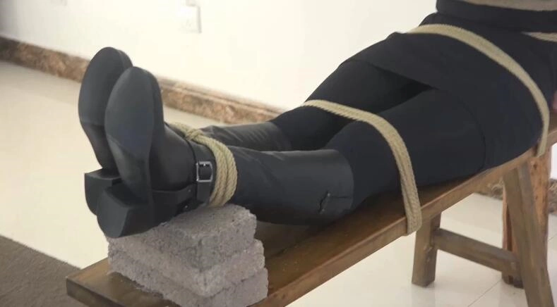 大美女琳琳,双脚被捆绑起来,和戴上重镣,手舞足蹈的跳起舞蹈来,三套服装,由于跳的不够好,被惩罚坐老虎凳,加了五块转来惩罚琳琳。