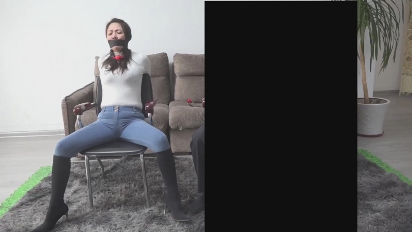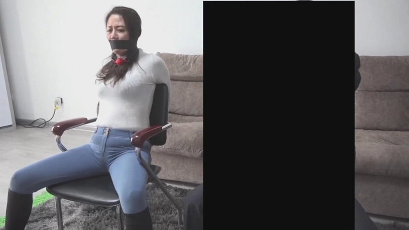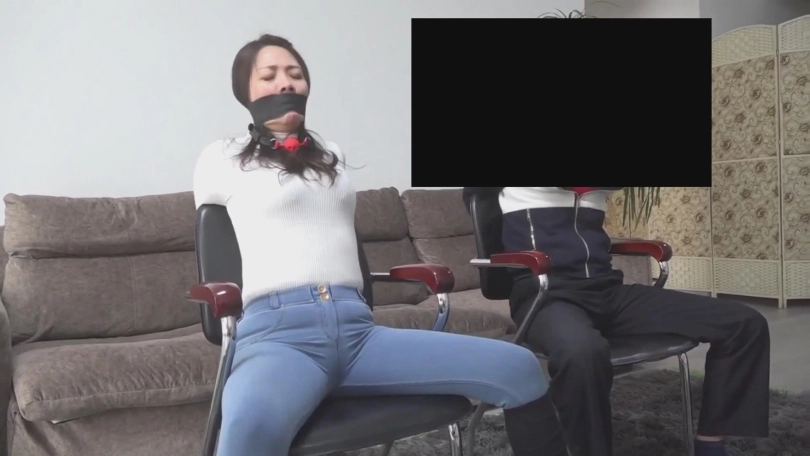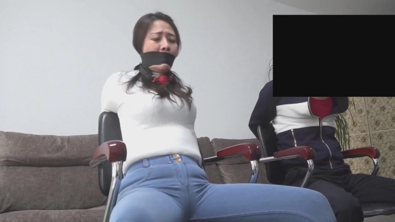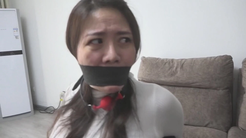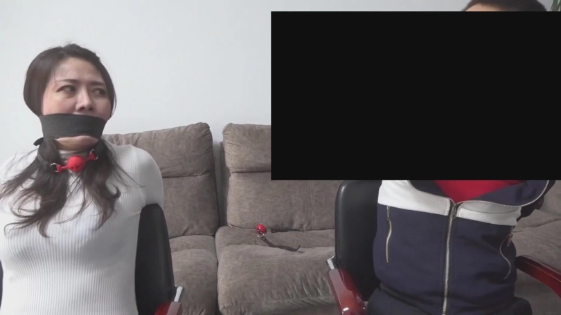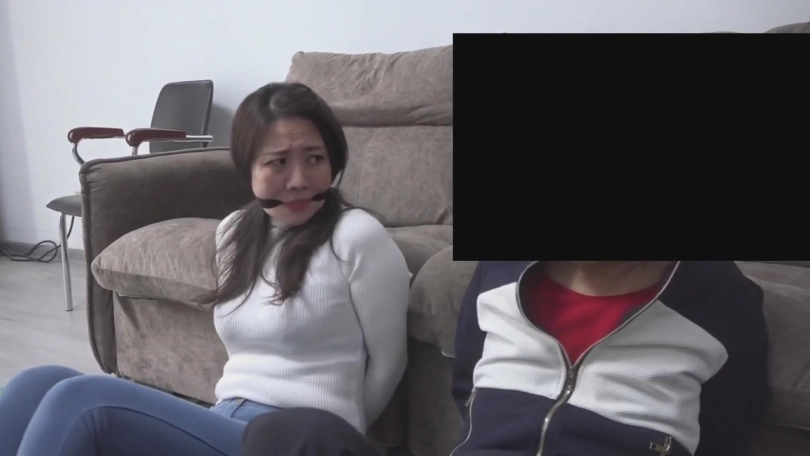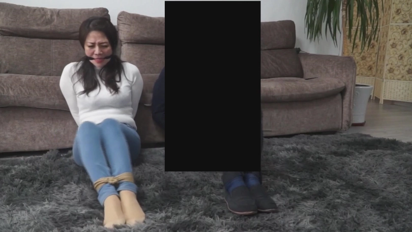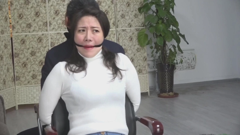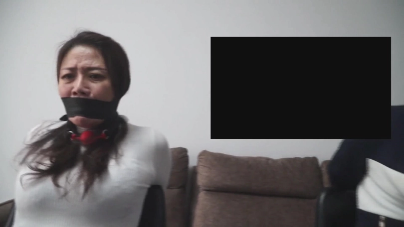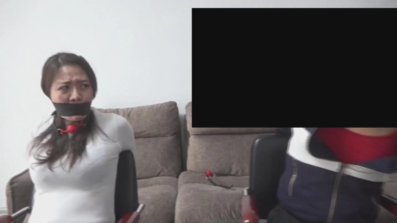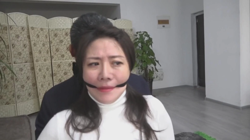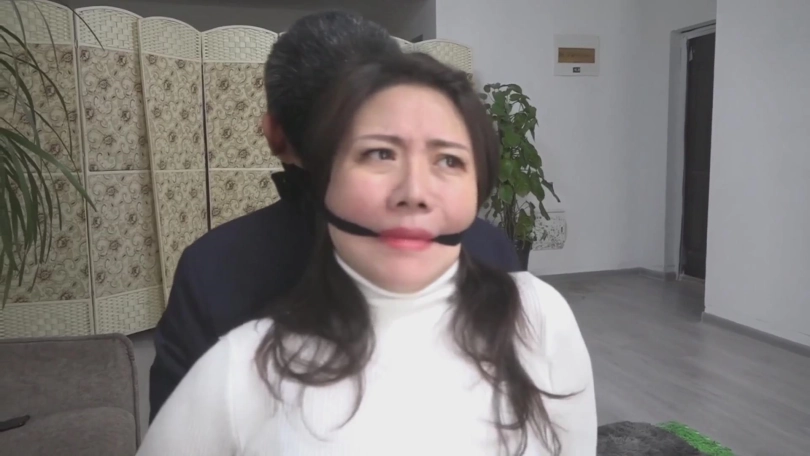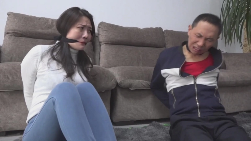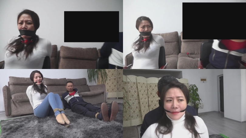 故事承接上集。女井队长林静和王老板被劫匪绑在客厅,由布团塞嘴改为胶带封嘴。两人挣扎了很久,接着劫匪突发奇想,将两人背靠背捆绑,并且用一条丝袜同时勒住两人的嘴巴。