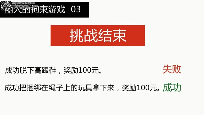 最后等美女急急忙忙的又费力的站起来,然后终于解开玩偶的时候,时间刚好结束,美女累死累活终于完成一个挑战了。