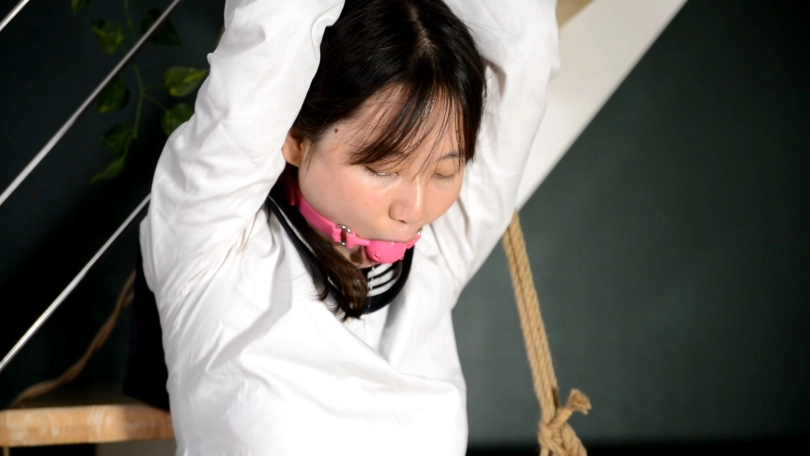本次小敏体验了难度更高的单腿吊缚,一开始有说有笑,异常兴奋,当时间一长便知道厉害了,表情变化明显,很是有趣。或许是对口球太过敏感,带的时候还有些抗拒,戴上后那口水哗哗的。比较担心的后手观音也顺利完成了,对小敏来说是不错的经历。