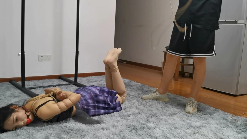 高颜值的美女青青,五官精致性格呆萌,一双大眼睛特别可爱。这次是中式五花紧缚, 然后再老规矩模特独自一人驷马放置挣扎寻找逃脱可能,不过这次用了一个大号口球,在脑后还用绳子牵引把口球的皮带向后拉,这样的话模特越想往外吐口球反而勒的越紧,正好青青的口水非常旺盛,从一戴上口球就开始流口水,最后口水把地毯一圈都打湿了,从青青的眼神里也可以看出她的幽怨了。