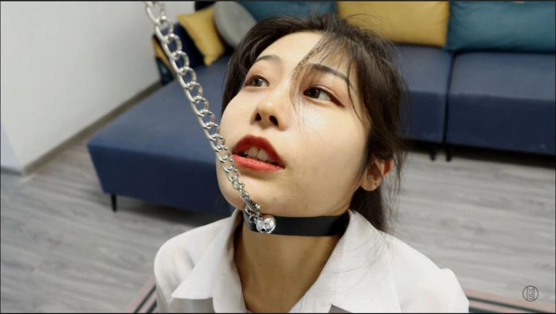 双脚被铁链缠绕,形成了简单粗暴又效果极佳的负重脚镣,幸亏之前穿了白色中筒棉袜来保护脚踝,不然拖着链子行走可能会磨破脚踝也说不定。既然自己已经失去自由与言语的权利,项圈的主导权也在主人手里,自己无论被牵到哪里都无法反抗了吧。