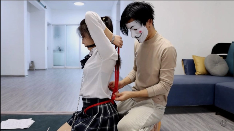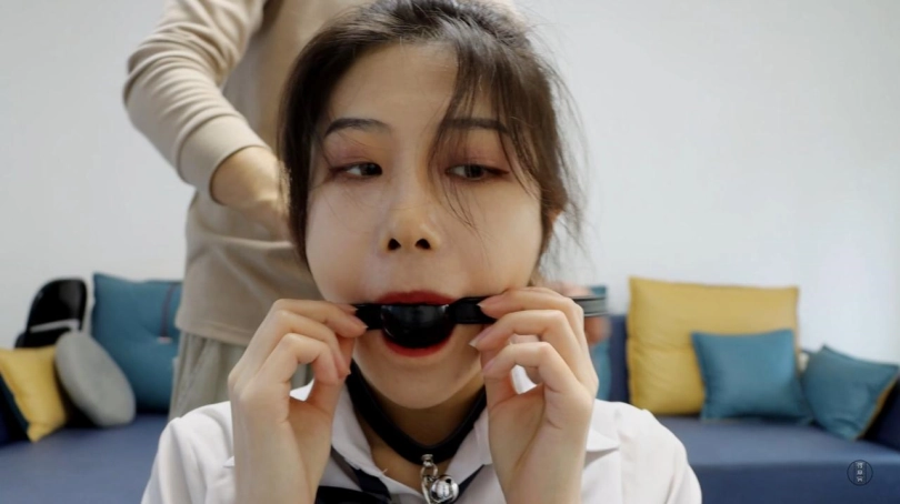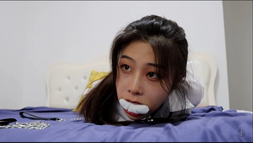 应主人的要求用塞口球堵住嘴巴,是为了让她不再发出多余的噪音,自然,也有可能是为了防止米娅因为经受不住股绳的折磨而发出奇怪的声音。双手被折叠于脑后,用手铐和拇指铐进行了简单又令人绝望的拘束,[X_X]的绳子逐渐勒入深处,而这跟绳子却连接在自己的拇指铐上,如此一来自己双手的任何动作都会使股绳更加深入,该说不愧是导演么?米娅心理暗自敬佩着导演的“专业”。