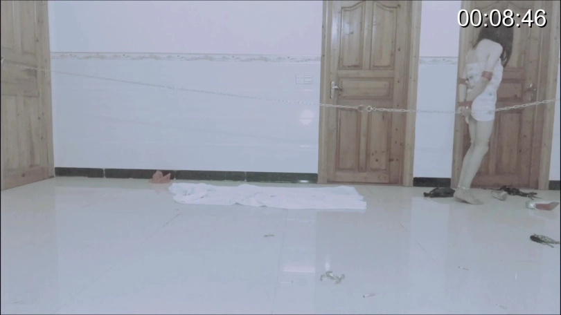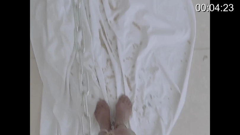 我在拍摄过程中也加了两点难度,为了增加行走的难度我在一段行走距离撒下了豆子,脱掉高跟鞋,穿着丝袜踩在豆子上,让自己行走增加了难度,而绳子也换为了铁链,走绳看过很多,铁链没有吧