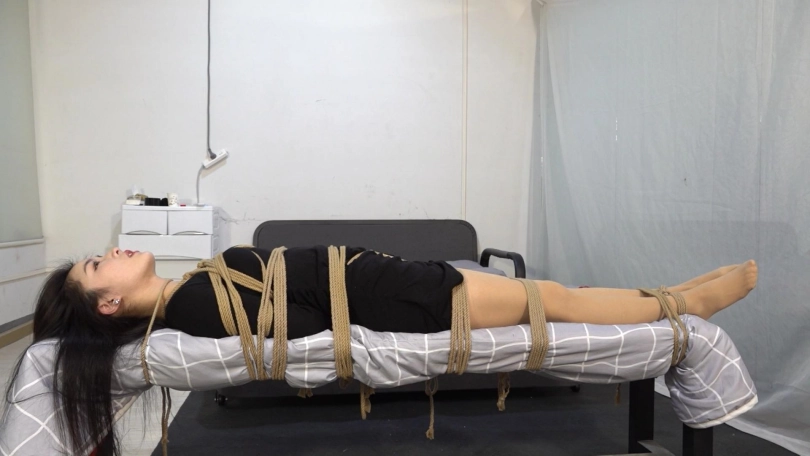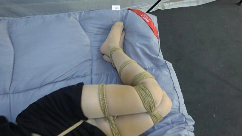小美被我扔到床上,我细细地观赏了小美一番,给她脱鞋,摸了摸她的上身和双腿。随后我把麻绳也一一扔到床上,开始对小美进行捆绑。
