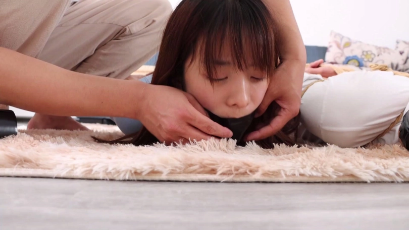 生气的劫匪将情侣二人驷马捆绑放置在沙发前地上,并说给二人换个东西塞嘴,拽出情侣二人口中原味锦纶丝袜后分别用两条丝巾塞入他们口中,并用黑色宽胶布剪下5张封嘴,再用黄色胶带和黑色弹力自粘绷带缠绕多圈将二人嘴封严实。