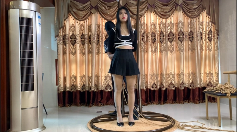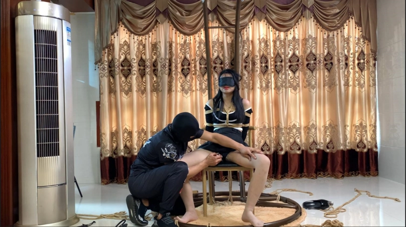 先把她吊捆起来,之后用振动道具慢慢折磨她,弄得她很想XX,发出了一阵一阵渴望的呻吟,眼神里充满了想XX的欲望。之后把她放在椅子上坐着,给她内裤里塞了个T蛋进去,不知道她起飞了没,只知道她内裤一直是湿湿的。