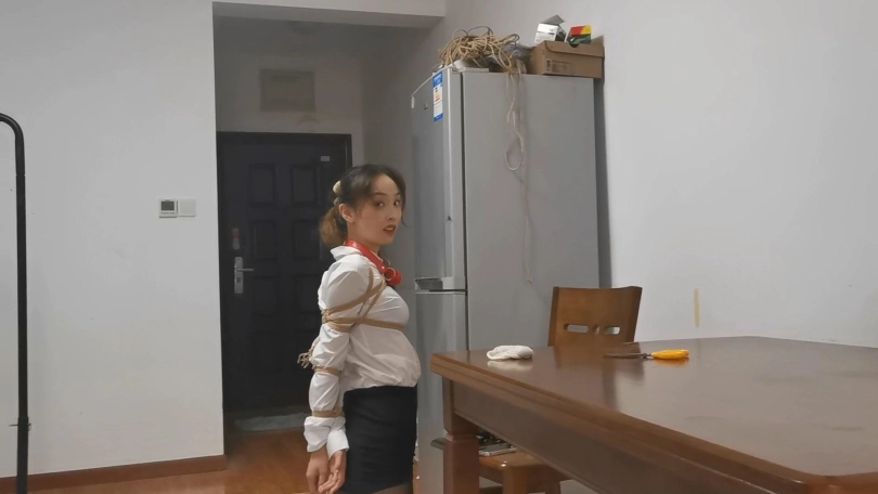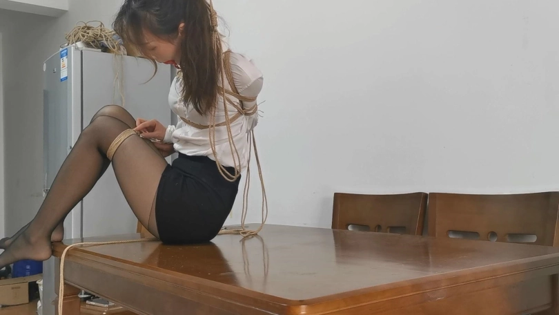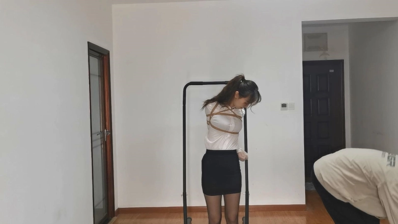 雨琪作为舞蹈生,身材和颜值都是顶级的,柔韧性更是好的惊人,绑一个多小时的欧式直臂手都不会麻。这次用了相当严厉的束缚,把她极限直臂驷马捆绑起来,双手用丝袜包住再用胶带固定手腕,大口球堵嘴再用绳子向后绑住头发。结果在这种严厉的捆绑下雨琪居然突破重重困难挣脱了腿上的绳子,柔韧性好的令人羡慕。