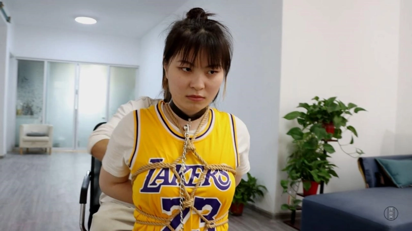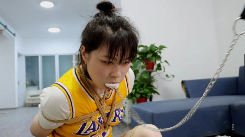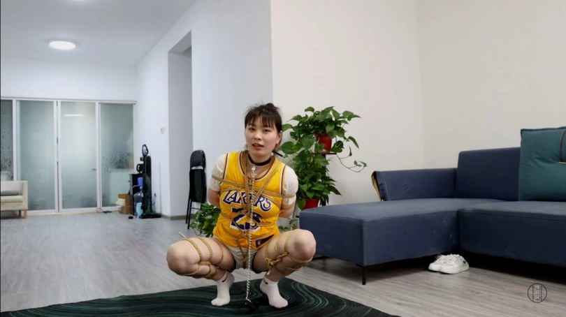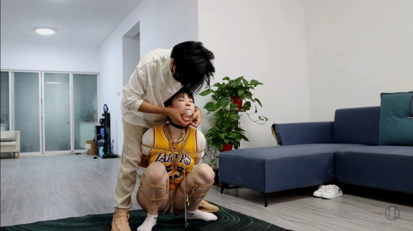 身上绑着龟甲缚的星宇脖颈上锁着一条项圈,项圈的另一头则是由军哥牵着的,军哥将星宇不情愿的拉出来,强迫让她跪在地上,解开手铐后,用绳子紧紧的绑缚住。