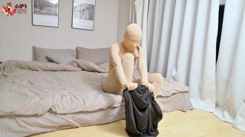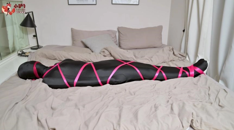 穿着肉色裤袜制成的Zentai的女M用黑色睡袋进行自缚挣扎,后被红色丝带捆住。