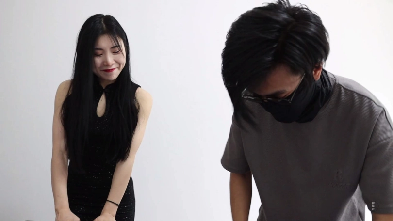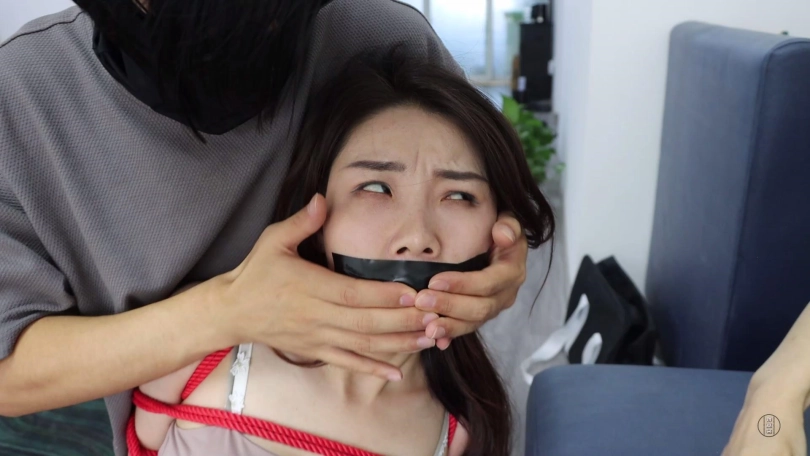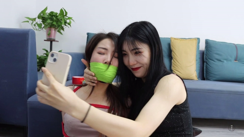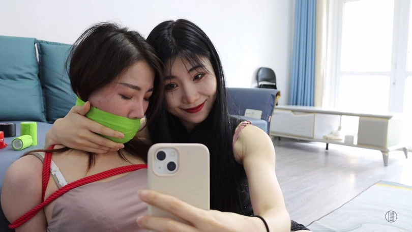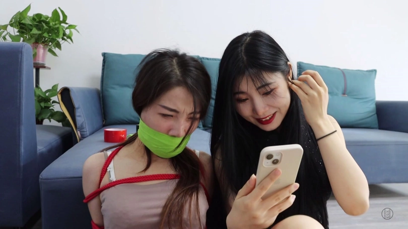 穿着肉色锦纶丝袜的柳洋坐在地上呜呜闷哼挣扎着,吴晗来回挑逗她,到后来干脆坐在柳洋旁边拿柳洋的手机给她拍照,故意二人一起合影后拿给她看进行羞辱,还说要把这些照片发给柳洋的亲朋好友看看。(这一段剧本上要求两个模特自由发挥,两位表演都很精彩)