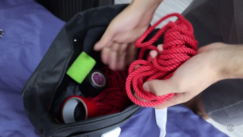 吴晗问男友东西都没到没有,男友说都买到了,打开拿着的塑料袋一看,里面是绳索、胶布绷带等束缚工具,吴晗笑着说拿着这些东西好好招待柳洋一下,二人拿着束缚工具手反背慢慢走到客厅沙发处,柳洋:现在能把钱转给我了吧。