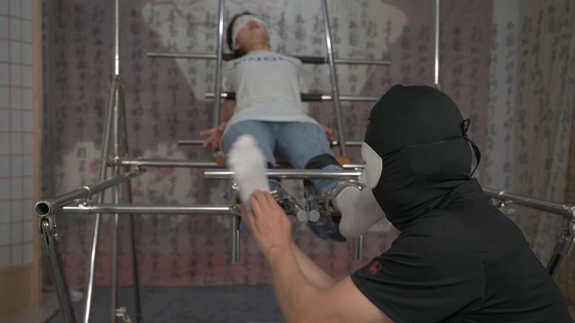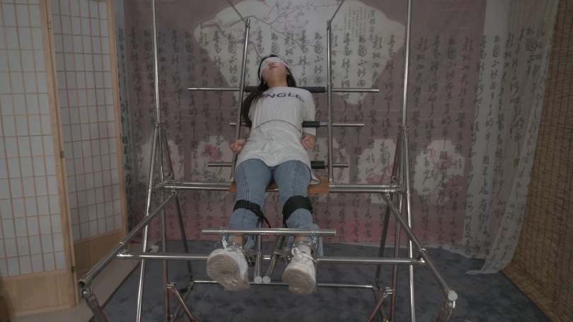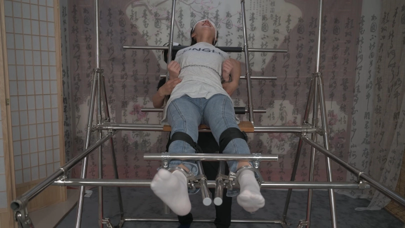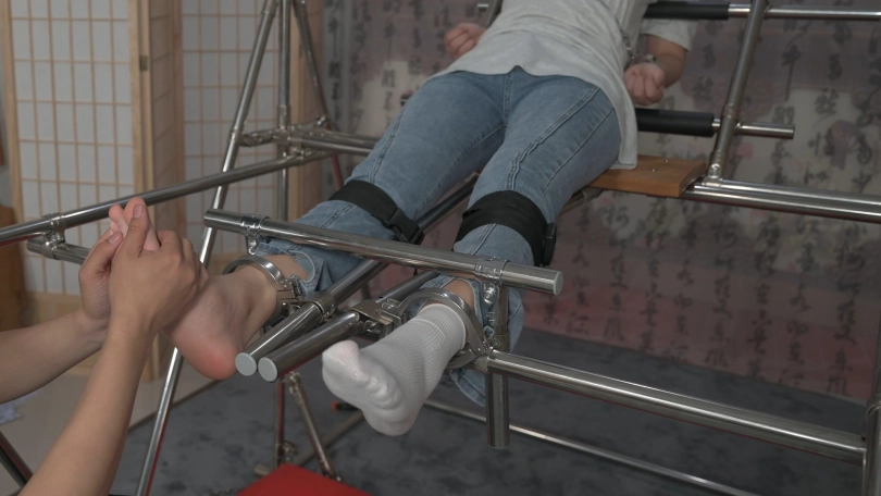 美女小黛在户外跑步,被人盯上,一路尾随到了小区,歹徒好像已经盯了很久了,他提前埋伏到楼道里,等小黛刚打开门的时候劫持了她,并把她带到早已设计好的刑房。小黛被固定住一动不能动,原来歹徒是要玩弄她刚刚运动完的棉袜美脚,他脱去小黛运动鞋,欣赏着她的美脚,接着不停地挠她的脚底、腋下,小黛无助的挣扎喊叫,直到被折磨的精疲力尽软软躺在刑架上。