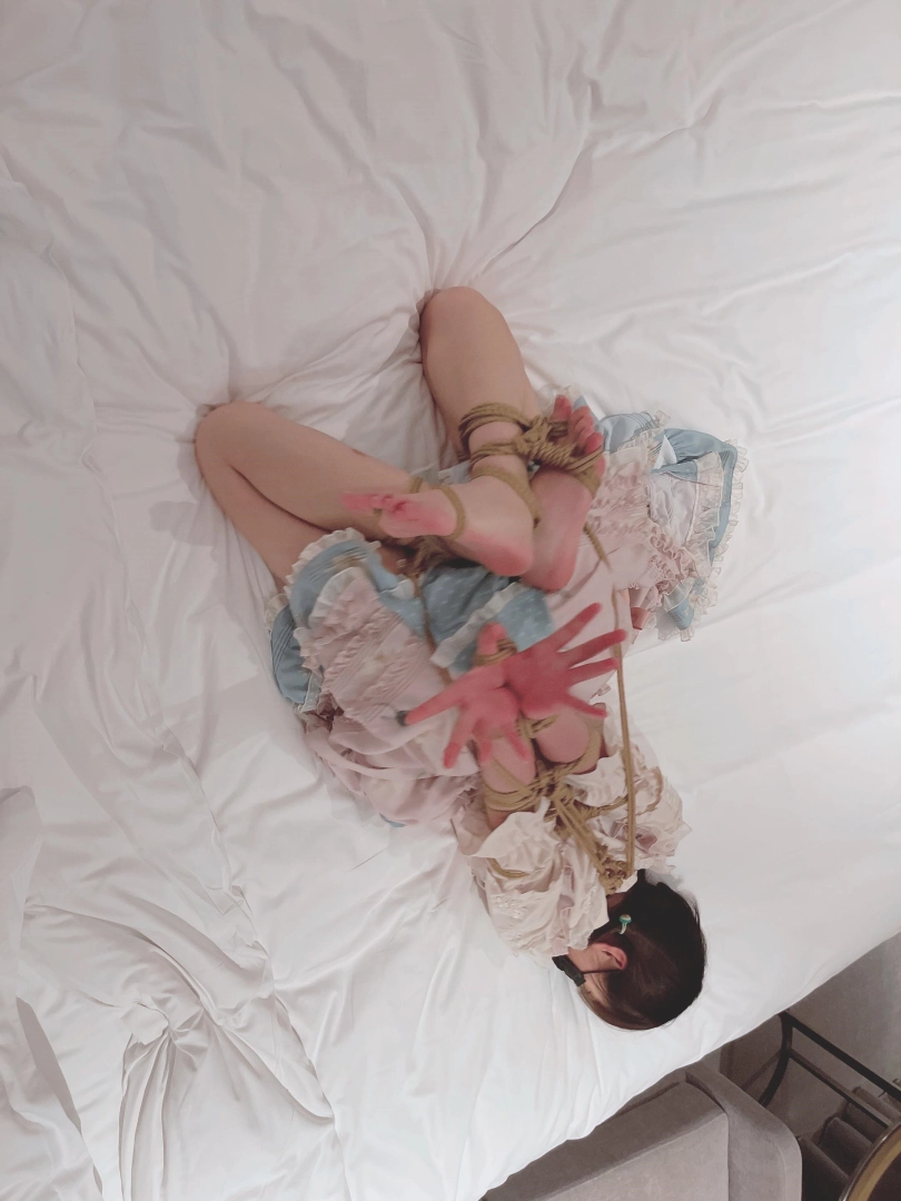 既然是紧缚,手指脚趾又怎么能放过呢?用两根绳子分别做一个折腿缚,再把折叠起来的双腿用盘腿缚的姿势绑起来,最后把脚腕茶茶分别固定在背后直臂的绳子上,然后用绳子把大拇指也捆在一起。为了保证茶茶的小脚丫动弹不得,这次还用绳子分别把两只小脚盘腿固定在另一只小腿上,连脚趾也不放过,同样把大脚趾绑起来和腿固定在另一只脚的脚腕上。