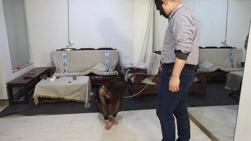 在小华的不懈努力下,小华考到年纪前十的好成绩,晚上来到女老师的办公室索要奖励,一进来便看到跪在地上的女老师,戴着手铐(手脚均用手铐,尽量使用筒式手铐),脖子上戴着项圈,项圈的一头捧在女老师的手里。