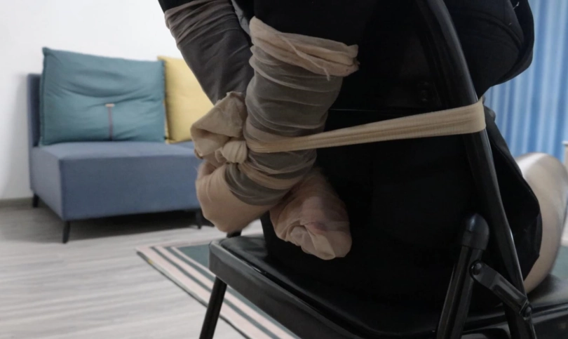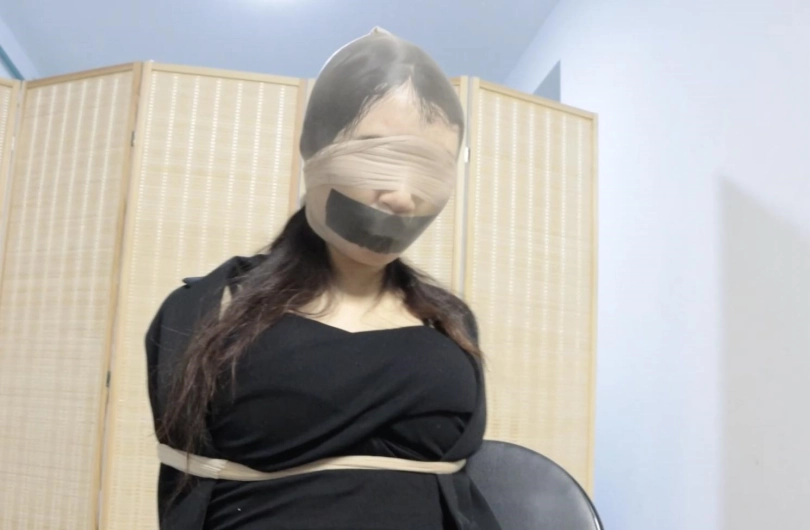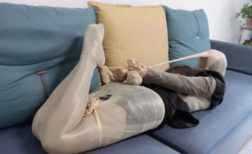 劫匪将女主拉回家,随后将女主从袋中抱出,等女主醒来。女主醒后挣扎一会儿,劫匪过来,拿下女主蒙脸,来看看你的新家,因为女主不说手机和银行卡密码,劫匪决定进一步惩罚,随后拿来油亮黑丝袜和高跟鞋,威胁女主把衣服脱掉然后换上,脱下的肉丝堵嘴,贴上黑胶带然后放置在椅子上,丝袜套手,绑在椅子上用丝袜和绳子结合固定,脚踝绑一圈黑胶带。过了一会,劫匪拿来玩具按摩,女主脚乱动,劫匪再加丝袜包脚。油亮丝袜蒙眼套头随后劫匪让女主好好享受,女主挣扎。