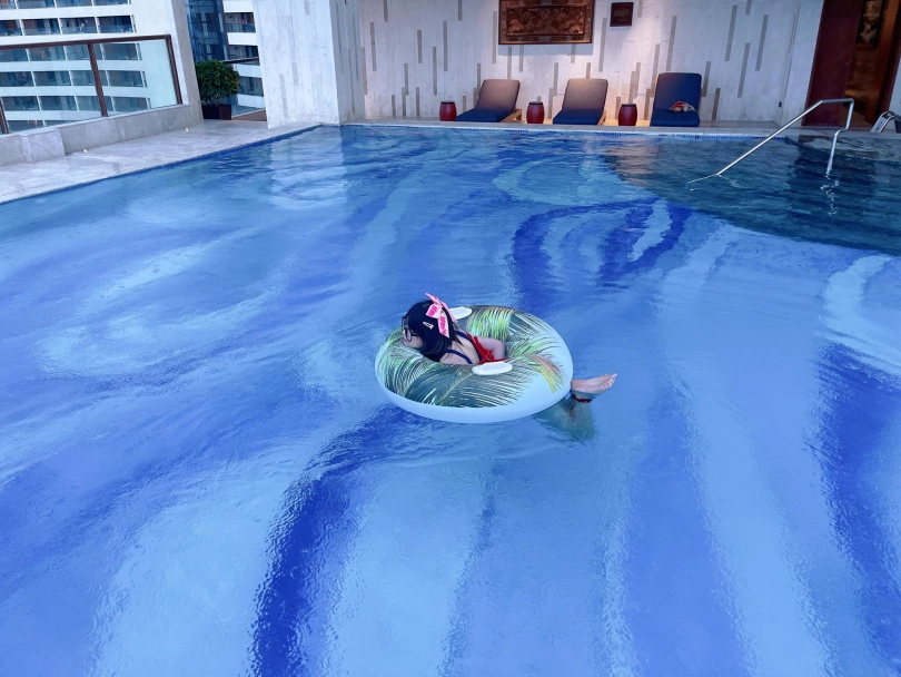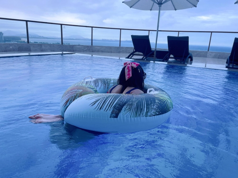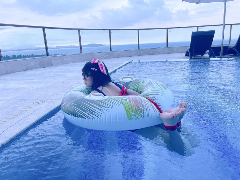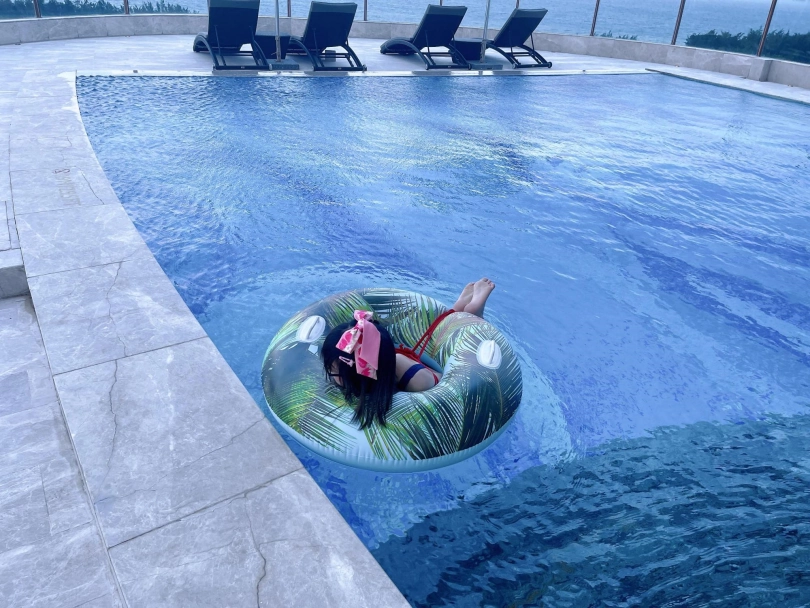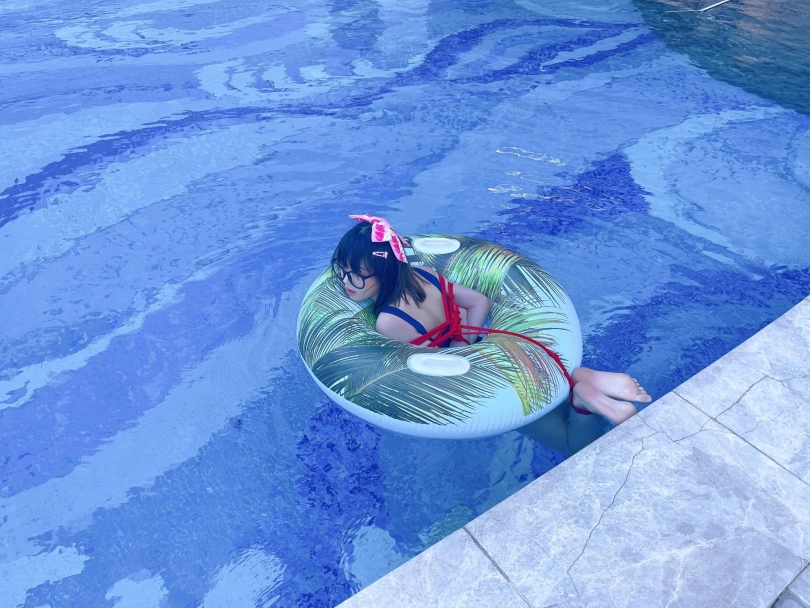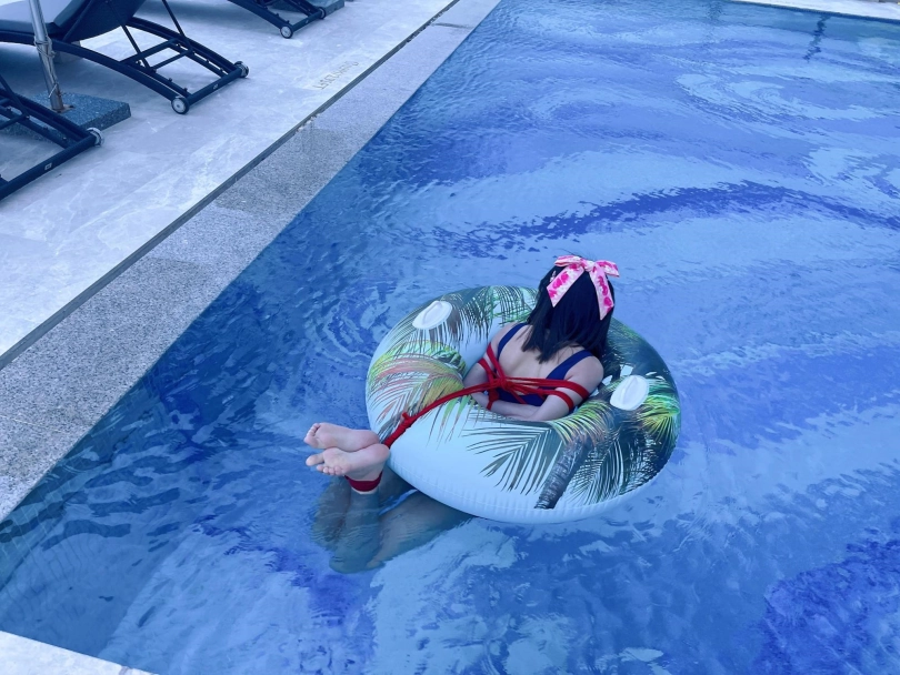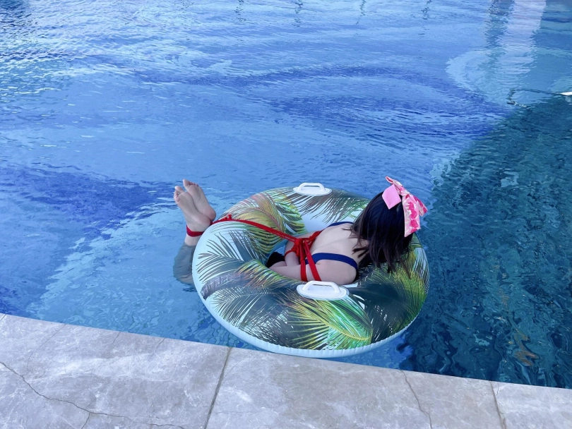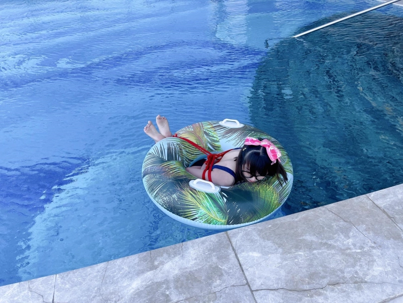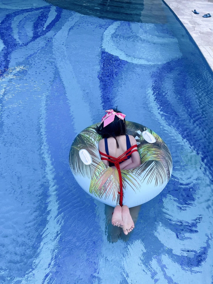 这次出去玩包了酒店三层,包括一个室外的海景泳池。正好提供了泳圈,又看到了穿着死库水玩水的茶茶...所以就把茶茶驷马绑在泳圈上,任由茶茶漂浮在水面。