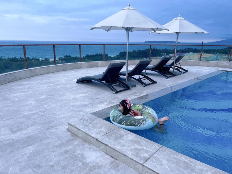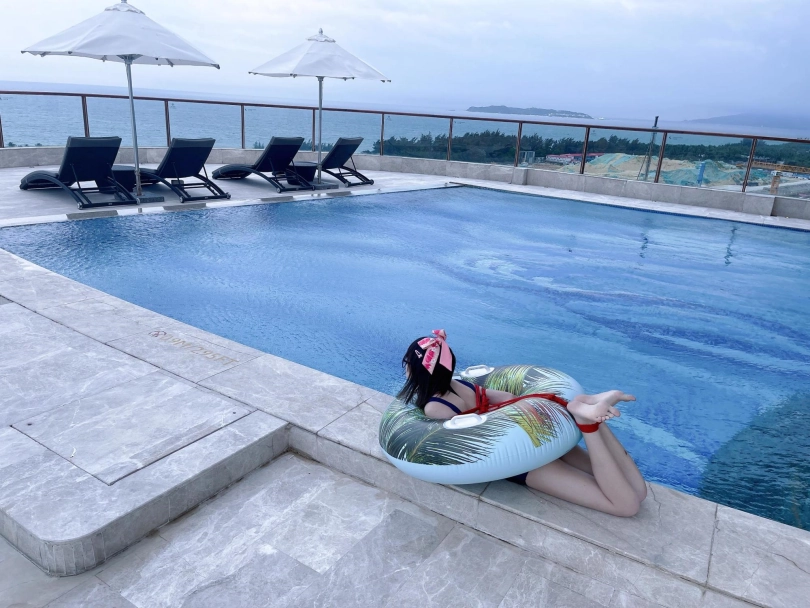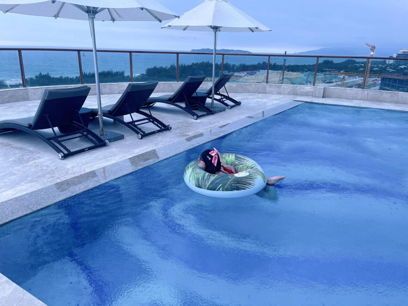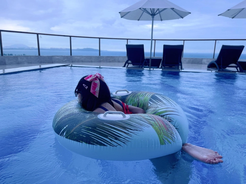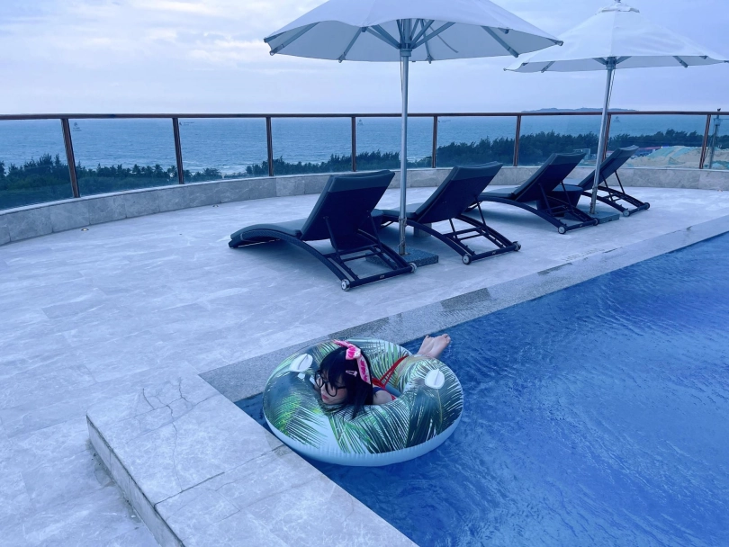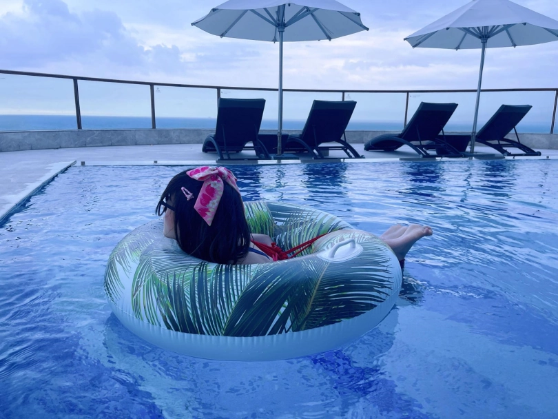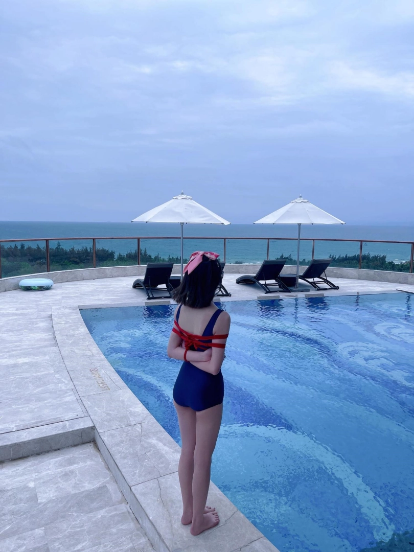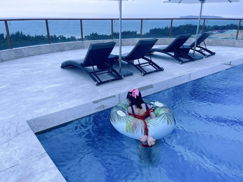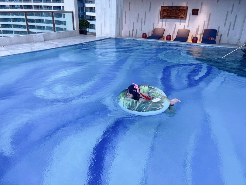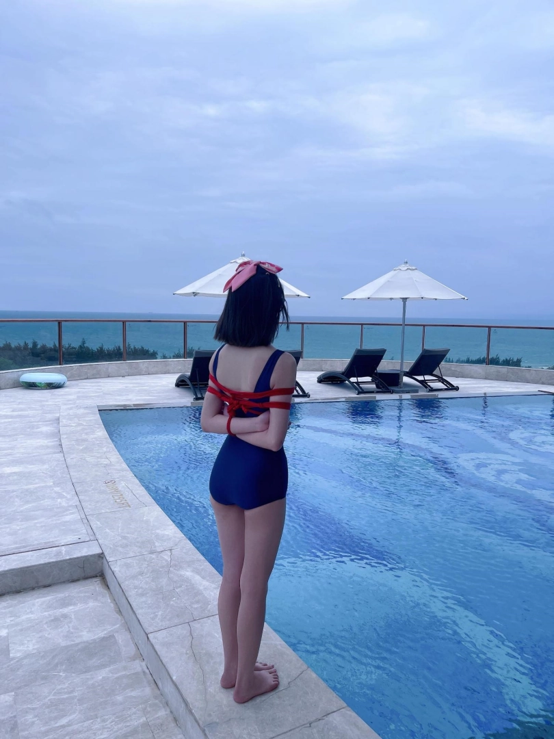 这次出去玩包了酒店三层,包括一个室外的海景泳池。正好提供了泳圈,又看到了穿着死库水玩水的茶茶...所以就把茶茶驷马绑在泳圈上,任由茶茶漂浮在水面。